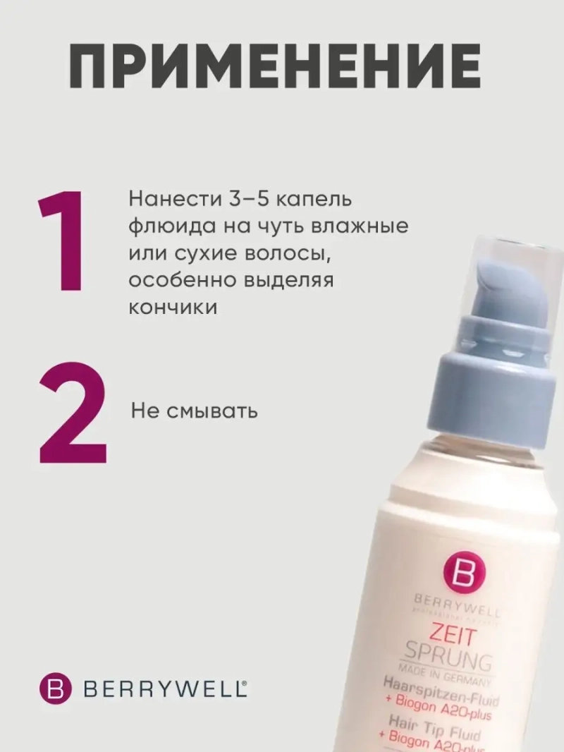 Флюид для кончиков волос Berrywell Hair Tip Fluid plus 51 мл. Флюид для Berrywell Hair Tip Fluid plus – это сверхлёгкое увлажняющее и питающее средство для восстановления кончиков волос. При регулярном применении число секущихся участков заметно сокращается, волосы разглаживаются, не путаются и легко расчёсываются, обретают ухоженный вид и великолепный блеск. Невесомая консистенция флюида обеспечивает простоту впитывания и мгновенное проникновение в структуру прядей. Средство оказывает мощное поддерживающее и защитное действие, не загрязняя и не утяжеляя локоны. Экстракт сладкого миндаля способствует регенерации, активизирует рост волос и предупреждает появление секущихся кончиков, сохраняет насыщенность цвета и придаёт блеск. Протеины пшеницы усиленно увлажняют, препятствуют потере драгоценной влаги и предохраняют от пагубного действия окружающей среды. Протеины шелка заживляют повреждения волосяного стержня, разглаживают поверхность прядей и делают их шелковистыми и блестящими, препятствуя спутанности, тусклости и ломкости. Масло макадамии укрепляет корни, предотвращая выпадение, и интенсивно питает и защищает кончики, предотвращая их расслоение даже под действием внешних агрессивных факторов. D-пантенол уплотняет и укрепляет локоны, возвращает им жизненные силы, делает эластичными, гладкими и шелковистыми.Применение: нанести 3–5 капель флюида на чуть влажные или сухие волосы, особенно выделяя кончики. Не смывать.