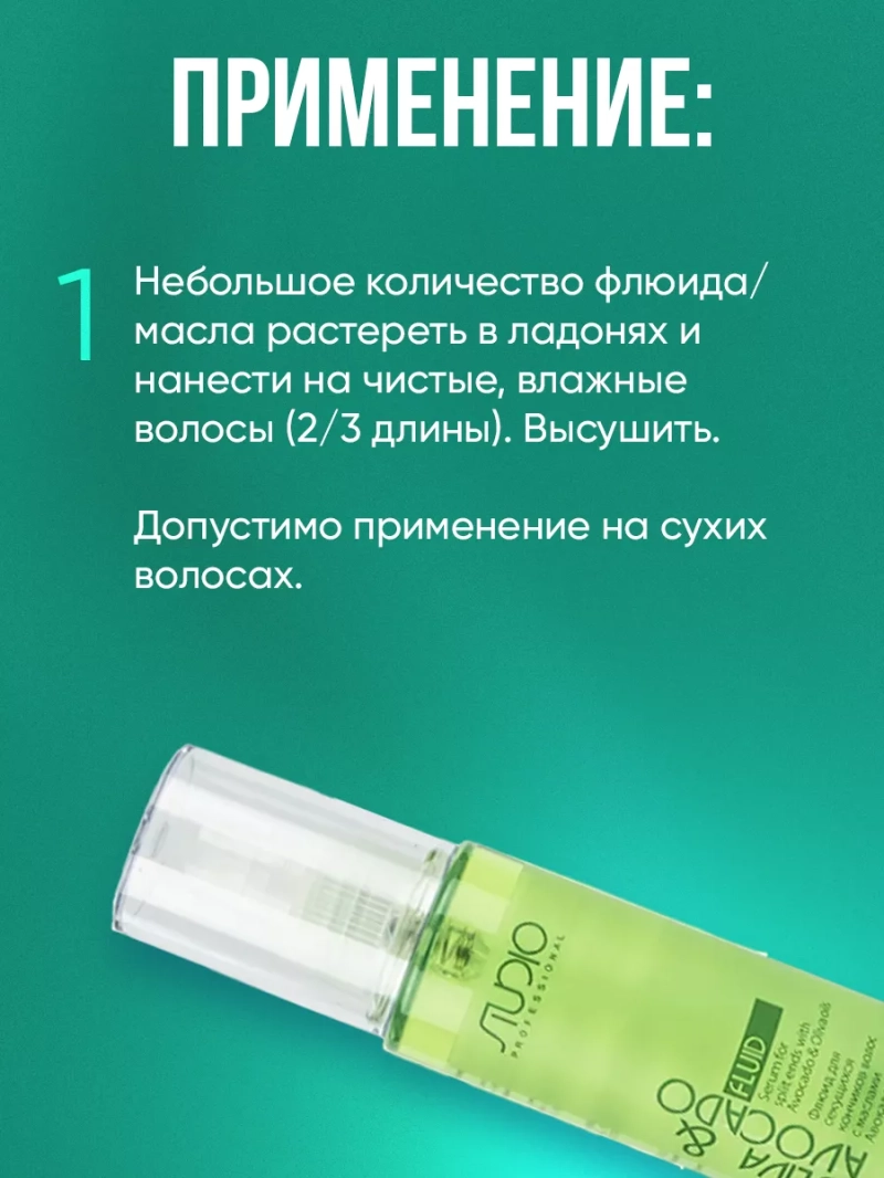 Флюид "Oliva Avocado" обогащен маслами Оливы и Авокадо, которые оказывают комплексное действие: восстанавливают и защищают поврежденные волосы, придают им невероятный блеск и шелковистость, обладают антистатическим действием. Флюид является лучшим средством для запаивания сеченых кончиков волос. Способ применения: 4-6 капель растереть в ладонях, нанести на влажные или сухие волосы. Выполнить укладку привычным способом. Состав: Cyclopentasiloxane, Isopropyl Myristate, Dimethiconol, Olea Europaea (Olive) Fruit Oil, Persea Gratissima (Avocado) Oil, CI 47000 (Yellow 11), CI 61565 (Green 6), CI 60725 (Violet 2), Parfum (Fragrance).