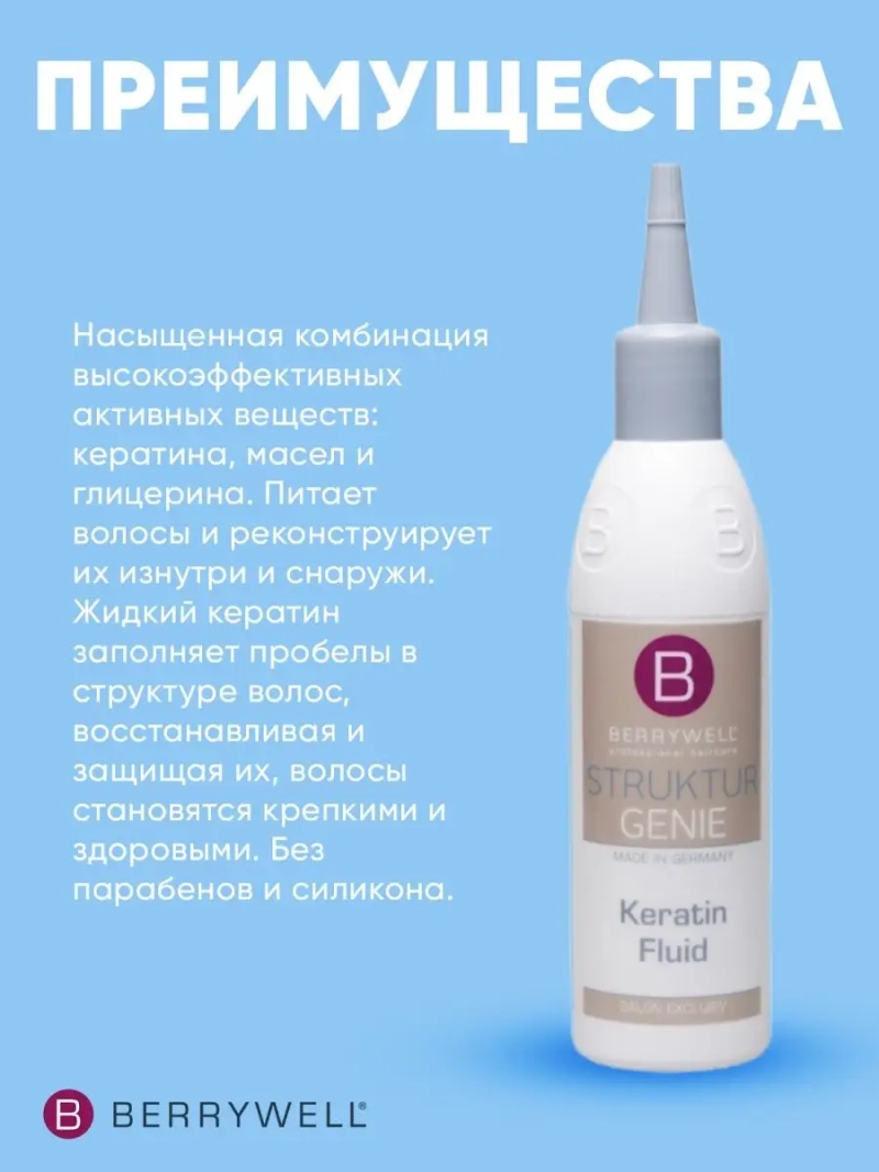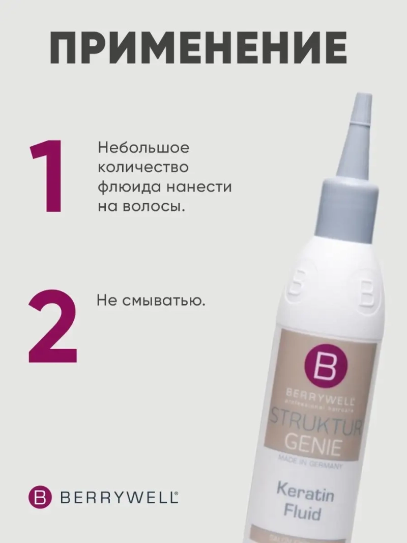 Кератиновый флюид. Эксклюзивный 2-ой салонный уровень реконструирующего сервиса. Насыщенная комбинация высокоэффективных активных веществ: кератина, масел и глицерина. Питает волосы и реконструирует их изнутри и снаружи. Жидкий кератин заполняет пробелы в структуре волос, восстанавливая и защищая их, волосы становятся крепкими и здоровыми. Без парабенов и силикона.