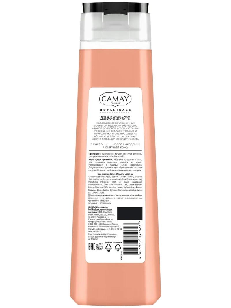 Полное наименование: CAMAY Гель для душа Абрикос и масло ши 400мл. Производитель: Unilever Россия. Почувствуйте на своей коже утонченный аромат спелого медового абрикоса с нежной ореховой нотой масла ши. Роскошные соблазнительные и манящие ноты спелых, сладких абрикосов невероятно притягательны в новинке от Camay – геле для душа Абрикос и масло ши. Масла ши и макадамии 100% натурального происхождения смягчают кожу и повышают её эластичность. Сразу после душа кожа нежная и мягкая.