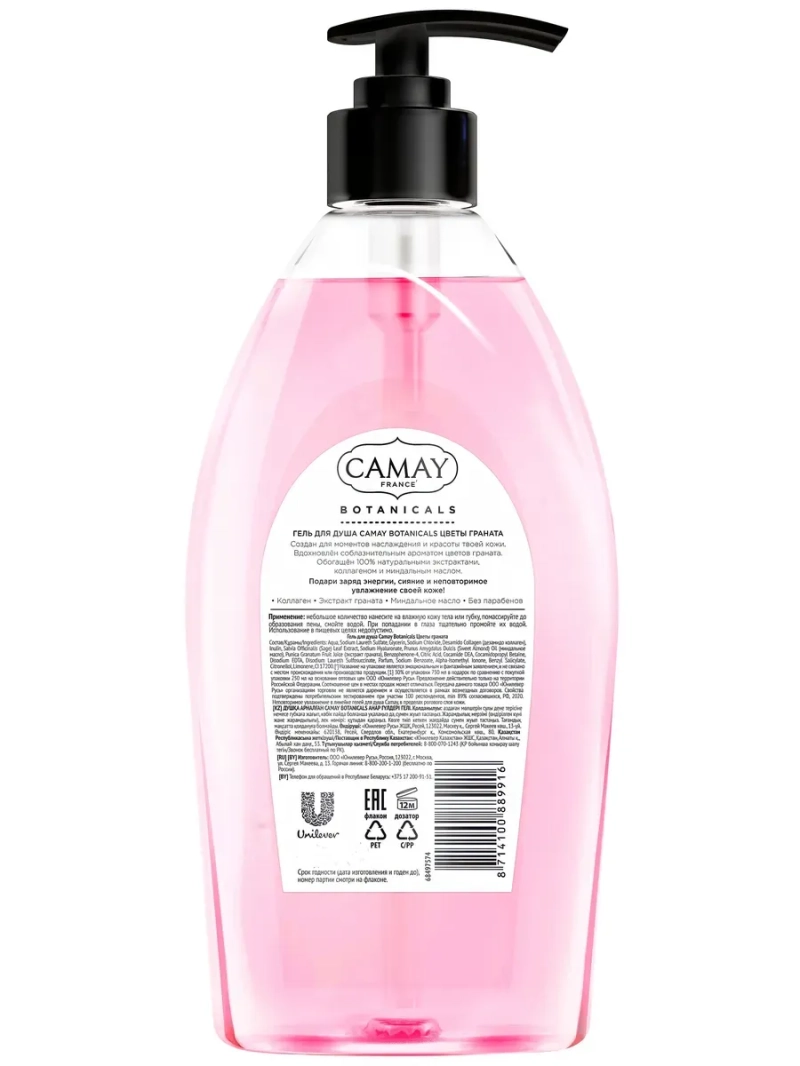 Полное наименование: CAMAY Гель для душа BOTANICALS Цветы граната 750 мл. Производитель: Unilever Россия. В ежедневной гонке сложно притормозить, чтобы восстановить силы. С гелем для душа Camay Botanicals Цветы граната ты сможешь уделить время себе и насладиться временем, проведенным в душе! Гель для душа Camay с ароматом цветов граната нежно очищает кожу и помогает расслабиться. Гель имеет 100% натуральную основу. Миндальное масло увлажняет, а коллаген способствует гладкости кожи. 95% участников потребительского теста2 подтвердили — гель для душа Камей не сушит кожу и делает ее мягкой и гладкой, 98% подтверждают эффективное увлажнение, а 96% — сияние кожи. Camay — наполнен жизнью, чтобы наполнить тебя. В основе уходовых средств Camay лежат разнообразные парфюмерные композиции, способные пробудить чувственность и подарить ощущение неотразимости. С продуктами от Camay обычный прием душа или ванны позволяет прочувствовать богатую историю парфюмерии, отраженную в ароматах легендарного бренда с начала прошлого столетия.