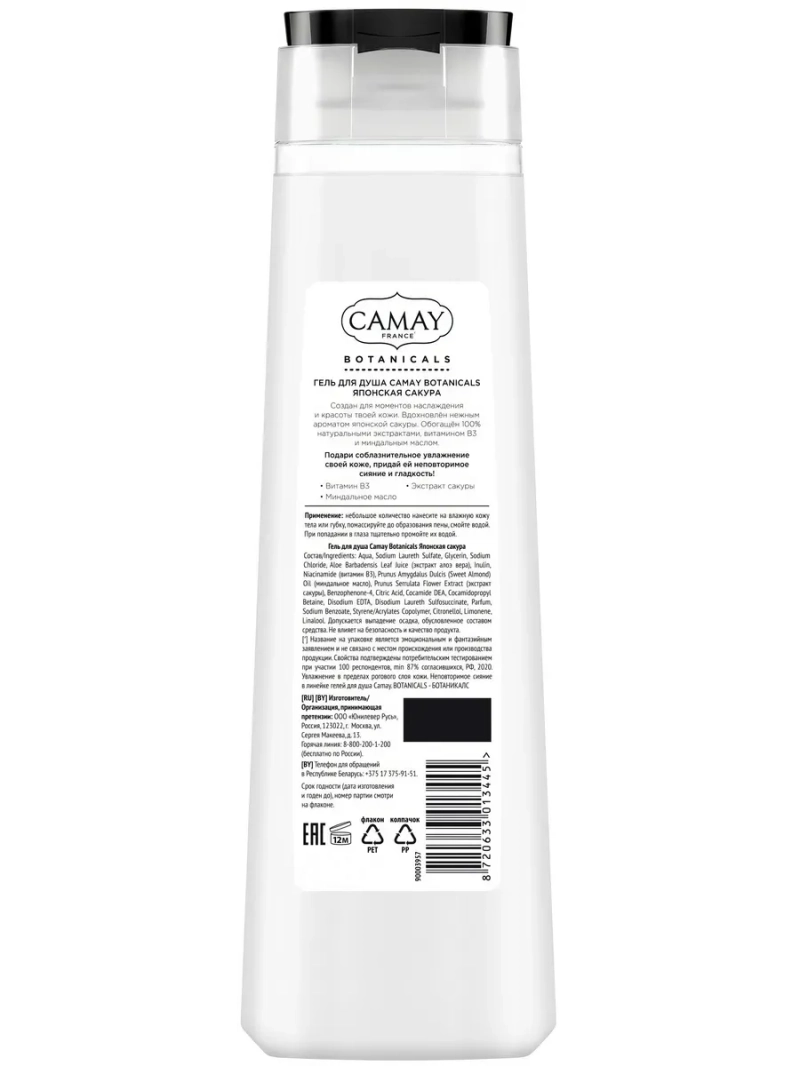 Полное наименование: CAMAY гель для душа BOTANICALS Японская сакура 400мл. Производитель: Unilever Россия. Попробуйте гель для душа Camay Botanicals Японская сакура! Он создан для моментов наслаждения и красоты вашей кожи. Вдохновлён невероятно нежным ароматом японской сакуры. Содержит 100% натуральные экстракты, витамины В3 и миндальное масло. Идеален для соблазнительного увлажнения кожи, неповторимого сияния и гладкости!