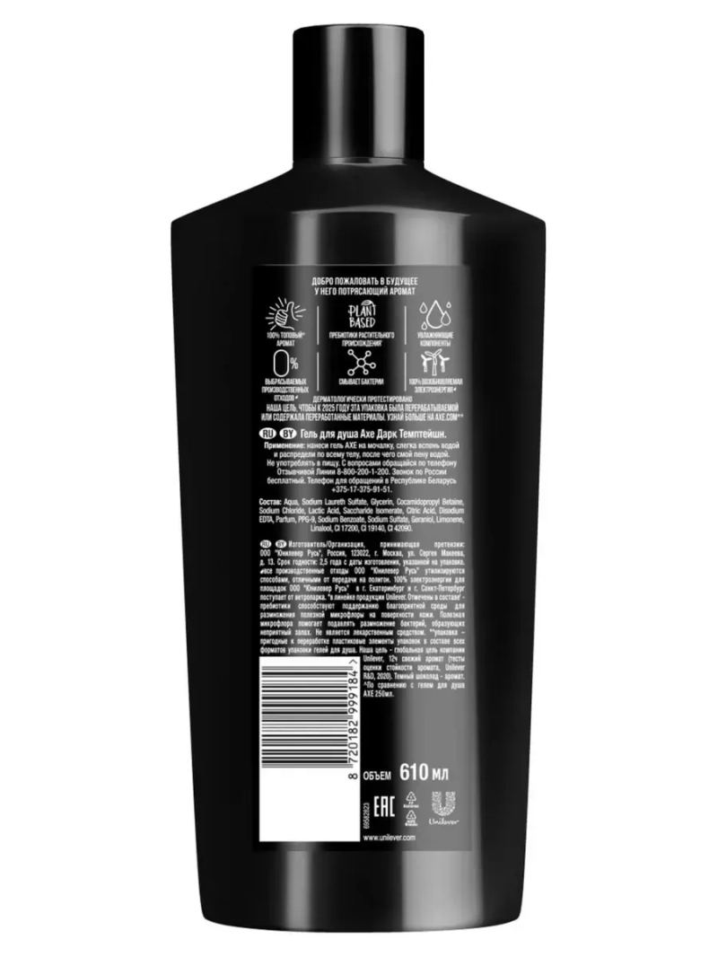Полное наименование: AXE Гель для душа Дарк Темптейшн 610мл. Производитель: Unilever Россия. Гель для душа Dark Temptation АХЕ с революционной технологией 2 в 1* обеспечивает защиту от запаха пота на 12 часов и дарит топовый аромат шоколада**. Без шуток! Не содержит парабены, эффективно смывает бактерии, очищает и ухаживает за кожей благодаря увлажняющим компонентам в составе. Все, что нужно для чистой, увлажненной, ухоженной кожи. Все гели для душа AXE дерматологически протестированы. *в портфеле продукции Unilever **12ч свежий аромат – тесты оценки стойкости аромата, Unilever R&D 2020