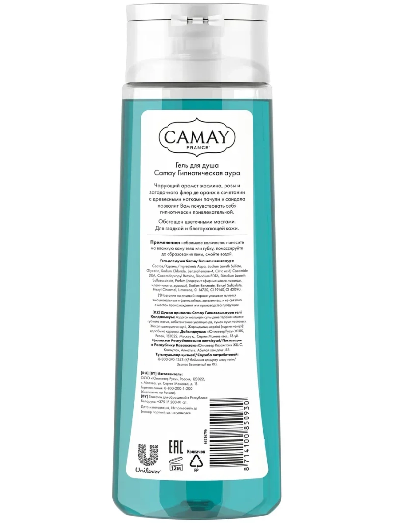 Полное наименование: CAMAY гель для душа Гипнотическая аура 250 мл. Производитель: Unilever Россия. Необычайная стойкость аромата CAMAY Гипнотическая аура Этот чувственный, завораживающий аромат геля для душа Camay Гипнотическая аура собрал в себе нотки полуночного жасмина и глубокий аромат масла пачули. Аромат включает эфирные масла лаванды, иланг-иланга, душицы.Попробуйте настоящее произведение парфюмерного искусства. Гель идеально подойдёт для вечернего приёма душа. Благородный аромат поможет расслабиться после насыщенного дня и ощутить полное блаженство, насладиться ароматерапией и уделить немного времени себе. Гель также прекрасно подходит для использования в качестве пены для ванн. Воздушная пена и нежные ароматы Camay Hypnotique не оставят равнодушным никого. Раскройте все грани своей чувственности с помощью магического сочетания ароматов Camay Hypnotique Aura. Приятная текстура геля хорошо вспенивается и мягко очищает кожу. А благодаря технологии Fragrance Pearls в составе геля для душа, его пленительный аромат остается на коже до 8 часов после душа!* Поэтому куда бы Вы ни пошли, Вы сможете оставить после себя незабываемое впечатление!