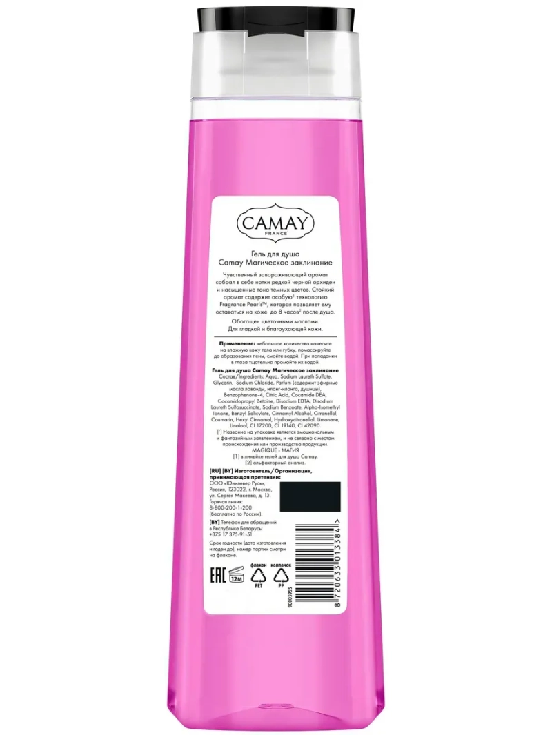 Полное наименование: CAMAY гель для душа Магическое заклинание 400мл. Производитель: Unilever Россия. Для гладкой и благоухающей кожи сразу после душа попробуйте гель для душа Camay Магическое заклинание. Его чувственный завораживающий аромат собрал в себе нотки редкой черной орхидеи и насыщенные аккорды темных цветов. Стойкий аромат содержит особую? технологию Fragrance Pearls, которая позволяет ему оставаться на коже до 8 часов2 после душа. Обогащен цветочными маслами. 1 в линейке гелей для душа Camay. 2 ольфакторный анализ.