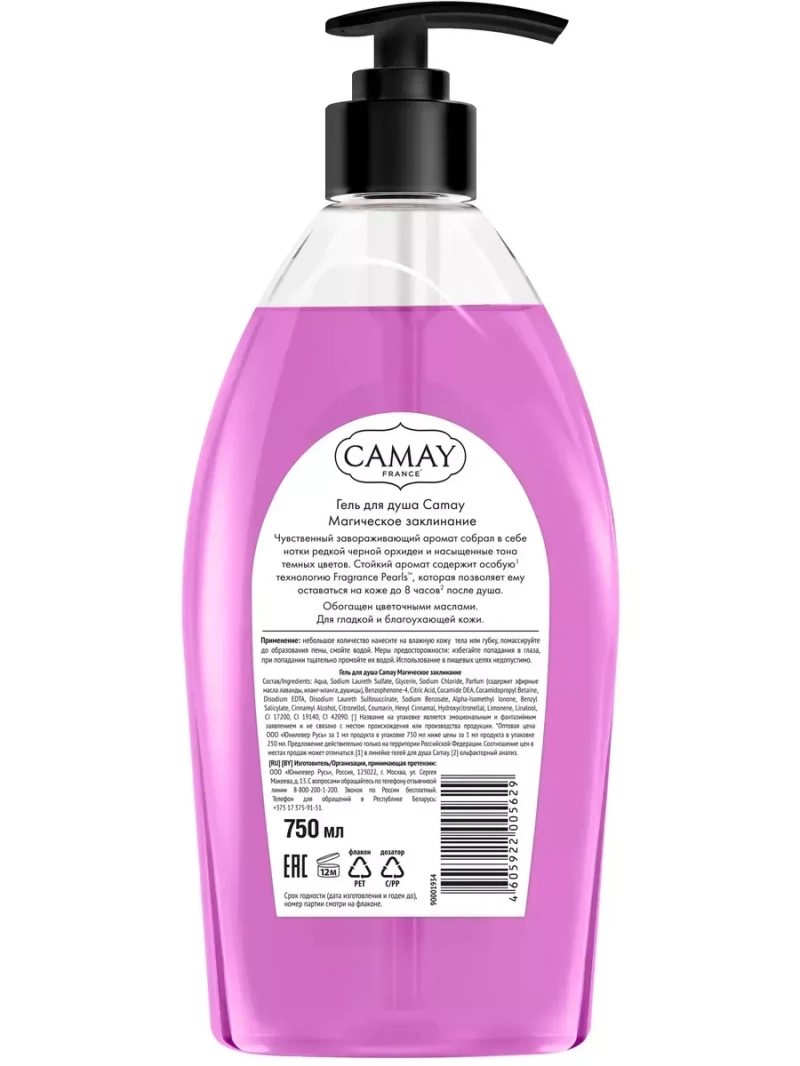 Полное наименование: CAMAY Гель для душа Магическое заклинание 750мл. Производитель: Unilever Россия. Попробуйте гель для душа Camay Магическое заклинание в объеме 750 мл и насладитесь гладкой и благоухающей кожей сразу после душа. Его роскошный аромат раскрывается нотками редкой черной орхидеи и насыщенными аккордами темных цветов. Особая технология Fragrance Pearls позволяет оставаться шлейфу на коже до 8 часов2 после душа. Обогащен цветочными маслами. 1 в линейке гелей для душа Camay. 2 ольфакторный анализ.