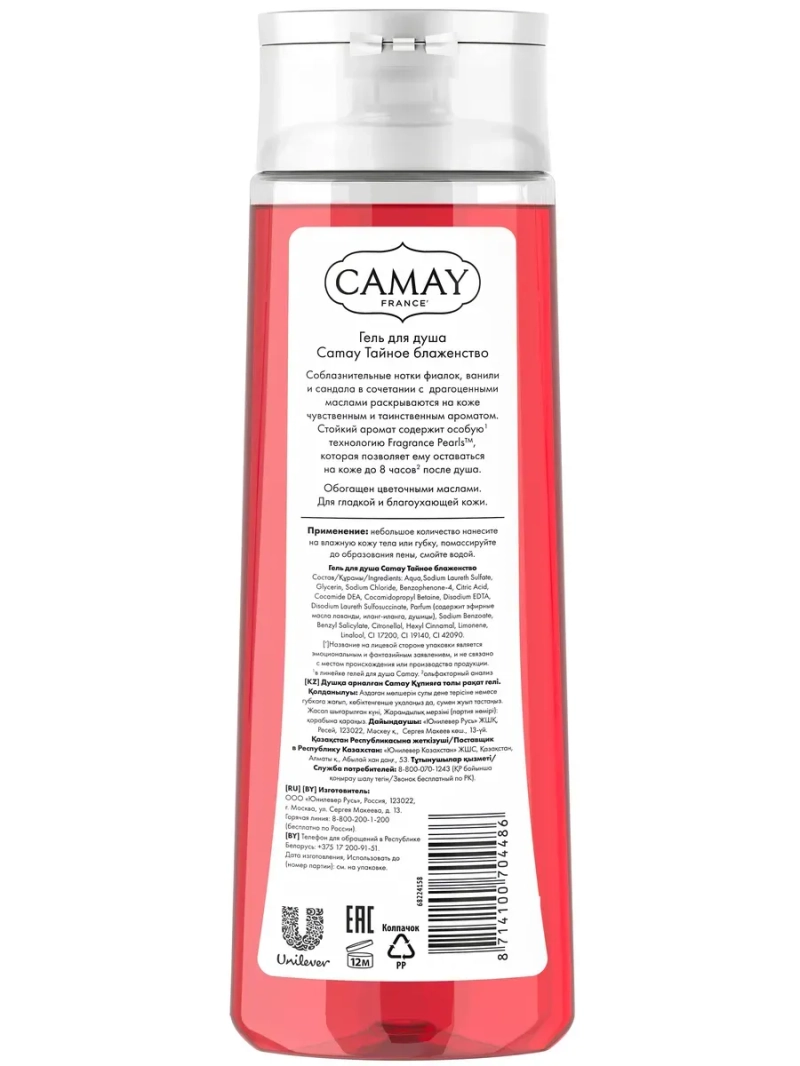Полное наименование: CAMAY гель для душа Тайное блаженство 250 мл. Производитель: Unilever Россия. Чувственное очарование CAMAY Тайное блаженство Эта чувственная коллекция собрана из драгоценных масел и соблазнительного аромата фиалок для особо утонченных и изысканных натур. Поистине неповторимый аромат и неожиданные сочетания собрал в себе гель для душа Camay Secret. Верхние тона насыщены ощущением спелого и сочного зеленого яблока, непредсказуемо переходящим в запах свежей зелени фиалок, в базовых нотах оставляя на коже длительный соблазнительно-сладкий шоколадный оттенок благодаря сандалу. Приятная текстура геля для душа Camay Тайное блаженство с ароматом фиалок хорошо вспенивается и мягко очищает кожу. А благодаря технологии Fragrance Pearls в составе геля для душа, его пленительный аромат остается на коже до 8 часов после душа!