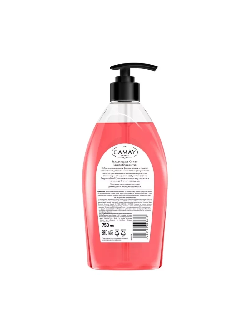 Полное наименование: CAMAY Гель для душа Тайное блаженство 750мл. Производитель: Unilever Россия. Для гладкой и благоухающей кожи добавьте в свой ежедневный уход парфюмированный гель для душа Camay Тайное блаженство. Соблазнительные нотки фиалок, ванили и сандала в сочетании с драгоценными маслами раскрываются чувственным и таинственным ароматом. Стойкий аромат содержит особую1 технологию Fragrance Pearls, которая позволяет ему оставаться на коже до 8 часов2 после душа. 1в линейке гелей для душа Camay. 2ольфакторный анализ.
