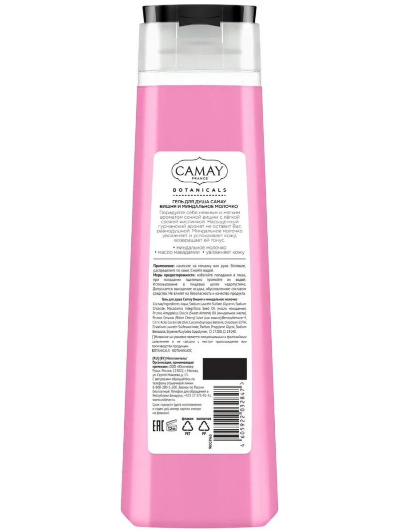 Полное наименование: CAMAY Гель для душа Вишня и миндальное молочко 400мл. Производитель: Unilever Россия. Попробуйте гель для душа Camay Вишня и миндальное молочко и ощутите чувственный аромат спелой вишни с легкой свежей кислинкой. Насыщенный гурманский аромат не оставит вас равнодушной. Миндальное молочко увлажняет и успокаивает кожу, возвращает ей тонус. Сразу после душа кожа выглядит ухоженной и увлажненной. Содержит 100% натуральные масла. Botanicals - Ботаникалс.