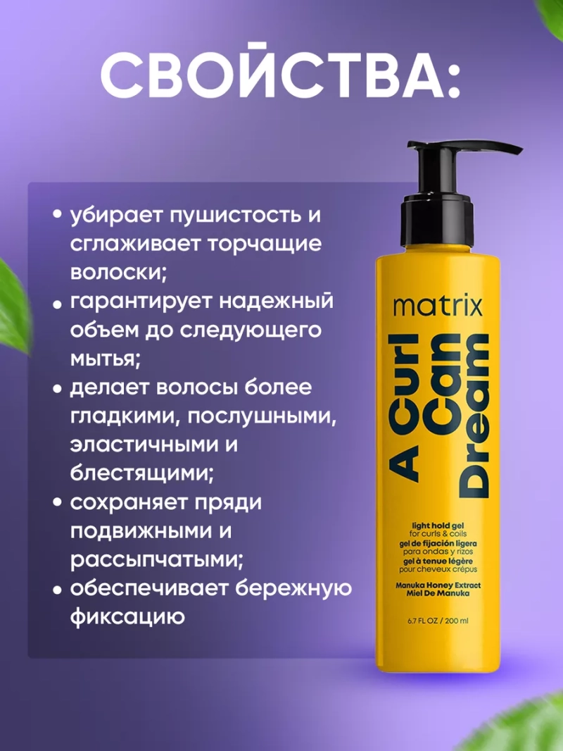 Вьющиеся и волнистые волосы всегда привлекают много внимания, но они отличаются высокой пористостью и требуют особого ухода, чтобы завиток имел красивую форму и обладал достаточной упругостью. Профессиональный гель L’oreal Matrix Total Result A Curl Can Dream создан для того, чтобы подчеркнуть естественную красоту и форму натуральных и окрашенных кудрявых волос. Уникальная формула содержит особый набор компонентов, оптимальный для волнистых волос. Экстракт меда Манука, как основной активный ингредиент, известен своими укрепляющими и восстанавливающими свойствами. Несмываемый гель добавляет блеск и сияние за счет сглаживания поверхности полотна волос. Благодаря легкой, но надежной фиксации, гель формирует и выделяет каждый заток без склеивания и утяжеления. Средство легко наносится на волосы, не комкуется и не оставляет налет. Абсолютно нелипкий гель для стайлинга не запутывает волосы и легко вычесывается. Ухаживающий гель делает шикарные локоны на непослушных и недисциплинированных тонких и жестких волосах. Текстурирующий гель для формирования кудрей убирает пушистость, сглаживает торчащие волоски, оставляет волосы эластичными, не делая их твердыми. Средство укрощает непослушные пряди, делая каждый завиток четким и придавая эластичную фиксацию. Профессиональный продукт улучшает структуру волоса и снижает потерю влаги, устраняет статическое электричество. Веганское средство отлично работает в условиях высокой влажности. Гель от Матрикс сохраняет волосы подвижными и рассыпчатыми и обеспечивает надежный контроль объема до следующего мытья. Гель замечательно работает при условиях естественной сушки волос, а также допускается его нанесение на волосы при условиях обычной сушки феном или при помощи брашинга или диффузора. После использования легкого геля волосы остаются здоровыми, упругими и блестящими. Без силиконов и парабенов. Органическое эко – средство можно использовать для всей семьи: как мужской, женский или подростковый вариант надежного укладочного средства.