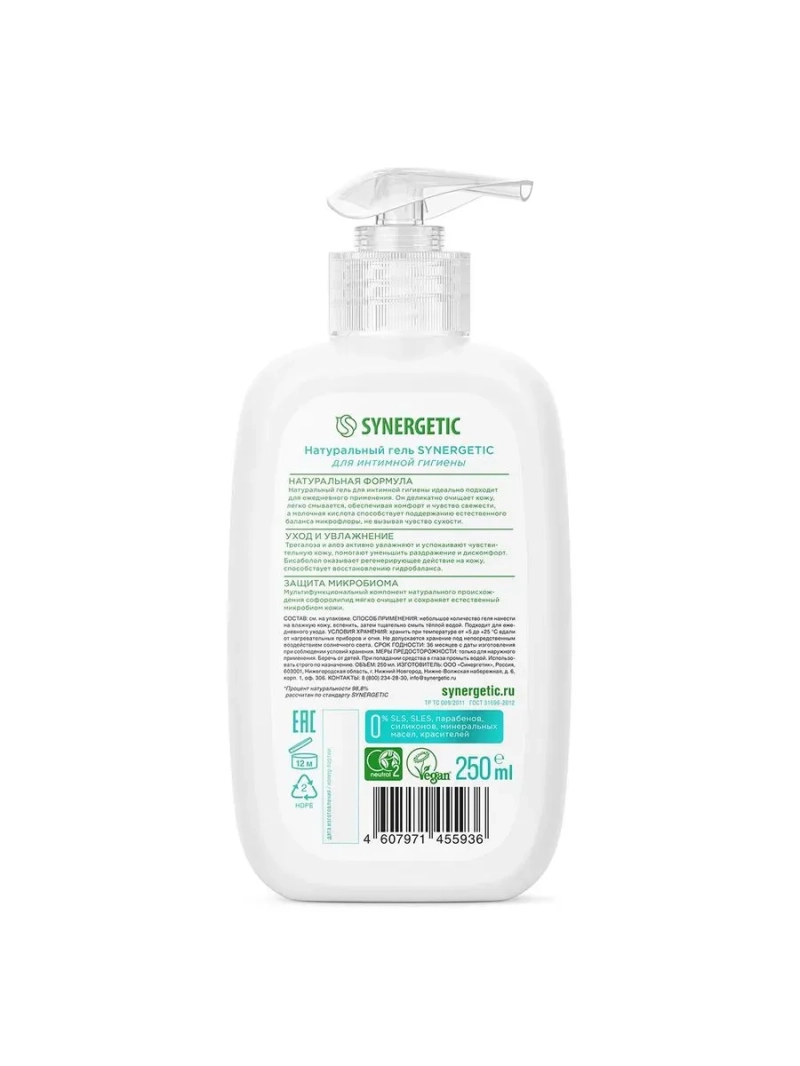Полное наименование: SYNERGETIC Гель для интимной гигиены 250мл. Производитель: SYNERGETIC Россия. Натуральный гель SYNERGETIC для интимной гигиены идеально подходит для ежедневного применения, обеспечивает деликатный уход за самыми нежными местами. Бессульфатная формула бережно очищает и увлажняет чувствительную кожу интимной зоны, поддерживая необходимый pH баланс, предотвращая раздражения и сохраняя естественную среду. Мультифункциональный компонент натурального происхождения софоролипид мягко очищает и сохраняет естественный микробиом, а натуральный пребиотик и природный антиоксидант трегалоза активно увлажняет и успокаивает чувствительную кожу. Бисаболол оказывает регенерирующее действие, способствует восстановлению гидробаланса. Активный увлажняющий комплекс в сочетании с соком алоэ вера обладает смягчающим, тонизирующим и противовоспалительным действием.