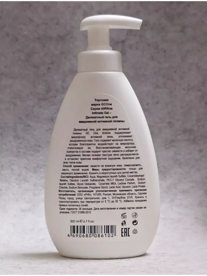 Очищающий женский гель для интимной гигиены AMINos Intimate имеет нейтральный Ph. Гель для интимной гигиены AMINos Intimate специально разработанный гель для деликатного ухода за самыми нежными зонами женского тела. В составе средства личной гигиены высокое содержание молочной кислоты, что способствует сохранению оптимального баланса чувствительной микрофлоры интимных зон тела. Гель бережно ухаживает за кожей и деликатно очищает, снимает раздражение, дарит ощущение комфорта, чистоты и свежести, подходит для ежедневного использования. В основе формулы продукта лежат уходовые компоненты, оказывающие антибактериальное и противовоспалительное воздействие. Гипоаллергенный состав мягко воздействует на чувствительную кожу и обладает успокаивающим эффектом. Очищающий интим гель для мытья подходит беременным женщинам, подросткам и детям. Особый состав нейтрализует неприятные запахи для продолжительного ощущения свежести. Активные компоненты средства личной гигиены AMINos обладают увлажняющим, питательным, защитным действием и помогают сохранить кожу в здоровом состоянии. Крем – гель для интимной гигиены не сушит кожу. Упаковка жидкого мыла - флакон 200 мл удобной формы – идеально для домашнего использования и с собой в дороге. Удобный дозатор при использовании выдавливает нужное количество геля, который образует густую пену. Гель для интимной гигиены с молочной кислотой можно приобрести в качестве уходовой косметики в подарок дочери, маме. Жидкое мыло для интимной гигиены с молочной кислотой отличный вариант для ухода за собой. Гель мыло для интимной гигиены применяется в душе и безопасен для всех типов кожи. Не вызывает раздражения. Нежный аромат крем геля для интимной гигиены с молочной кислотой дополнит ощущение свежести при использовании продукта. Гелевая текстура крем мыла AMINos не растекается в руке, дает густую пену и удобна в использовании. Результат использования: интенсивное очищение и уход за телом.