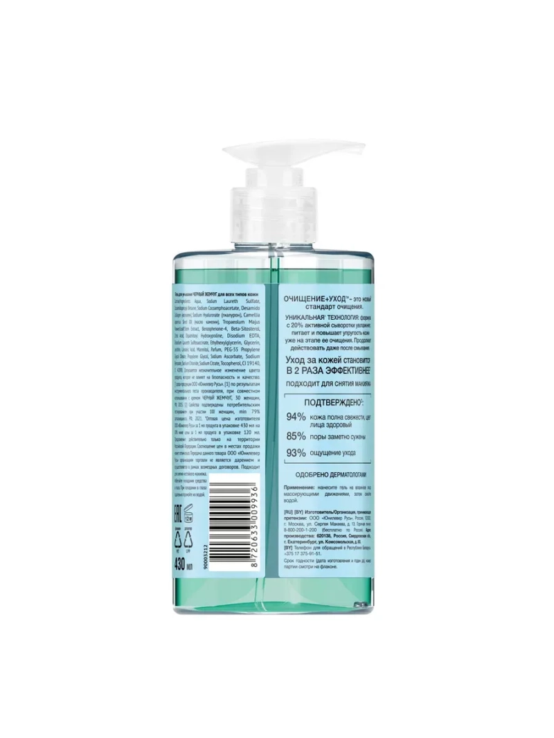 Гель для умывания ЧЕРНЫЙ ЖЕМЧУГ для всех типов кожи 430 мл. Попробуйте новый стандарт очищения* с гелем для умывания Черный Жемчуг для всех типов кожи, представленный в большом объеме. В его составе 20% активной сыворотки, которая увлажняет, питает и повышает упругость кожи во время очищения. Сыворотка с коллагеном, гиалуроном и маслом семян камелии продолжает действовать даже после смывания. *среди продукции ООО Юнилевер Русь.