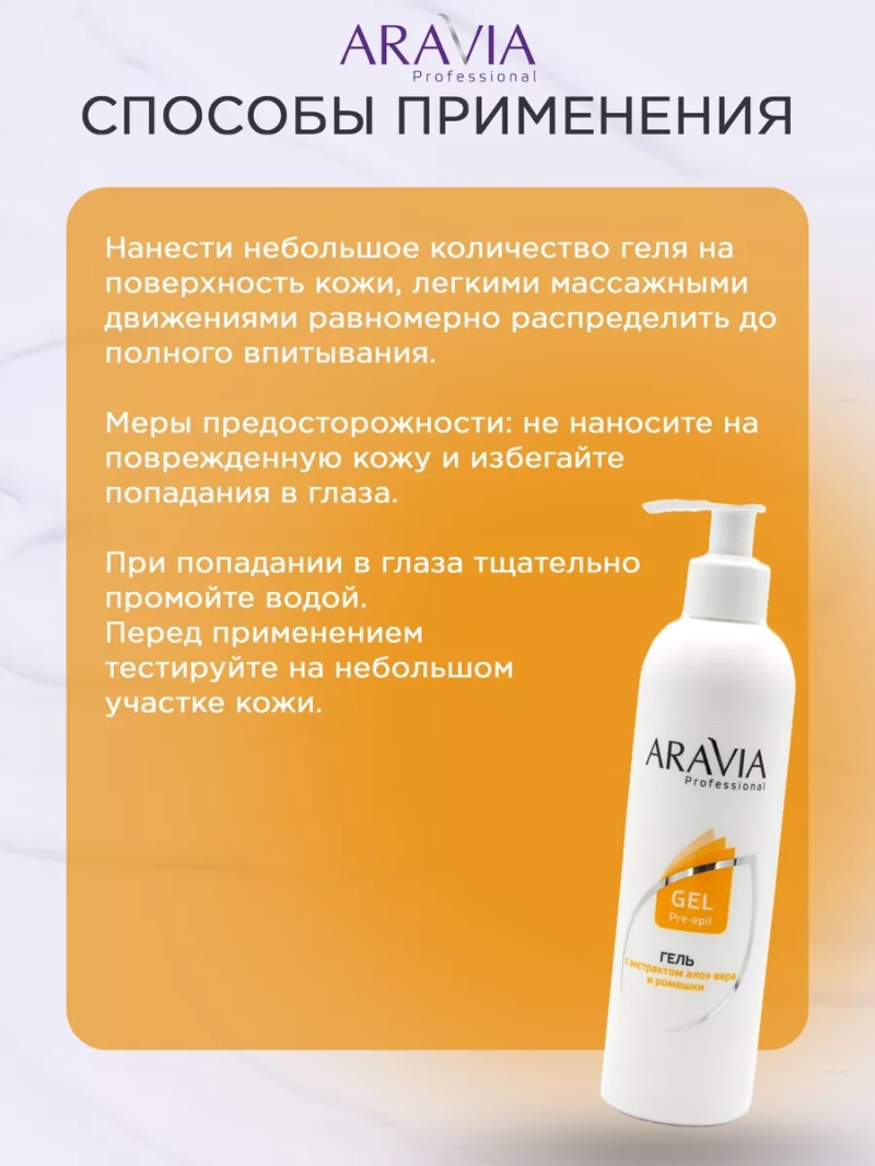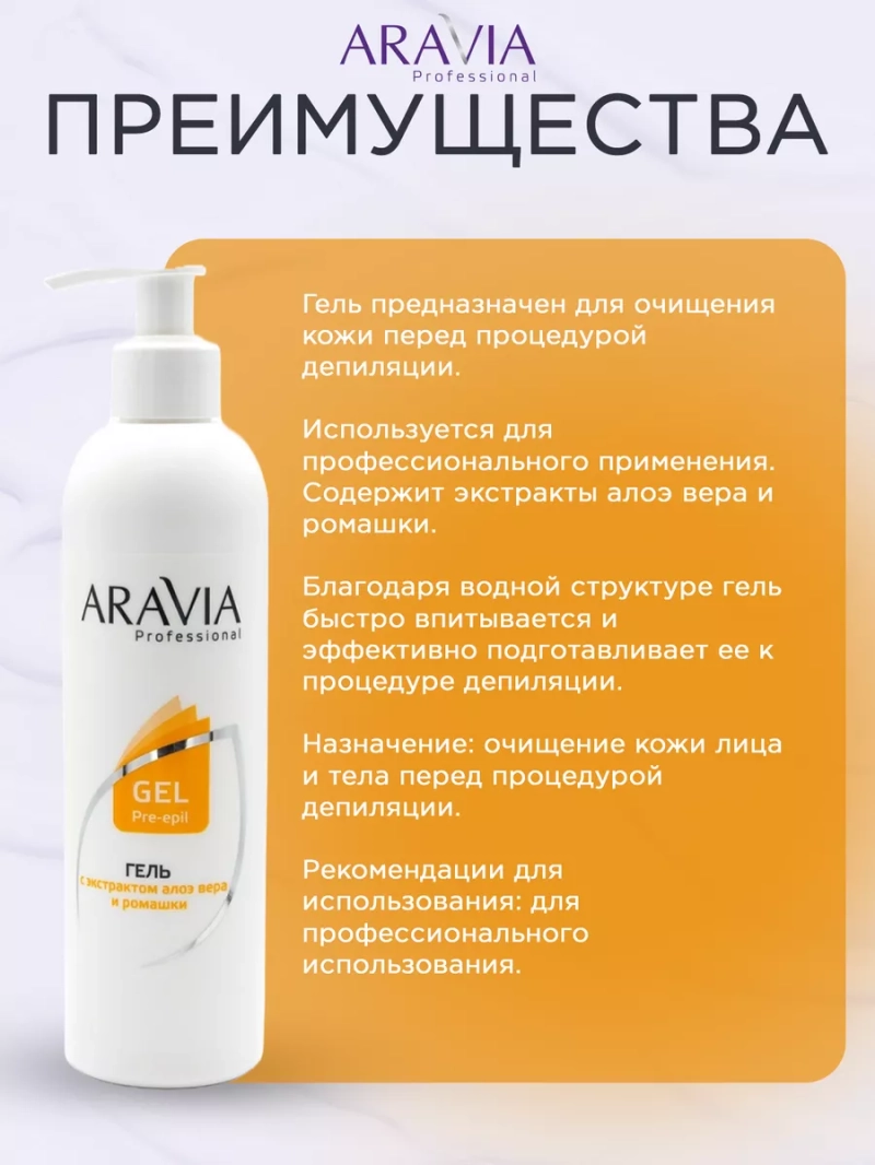 ГЕЛЬ ПЕРЕД ДЕПИЛЯЦИЕЙ С АЛОЭ ВЕРА И РОМАШКОЙ, 300 МЛ. Гель предназначен для очищения кожи перед процедурой депиляции. Используется для профессионального применения. Содержит экстракты алоэ вера и ромашки. Благодаря водной структуре гель быстро впитывается и эффективно подготавливает ее к процедуре депиляции. Назначение: очищение кожи лица и тела перед процедурой депиляции. Рекомендации для использования: для профессионального использования. Биоактивный состав: экстракт цветков ромашки, экстракт листьев алоэ вера. Состав продукта (INCI): Aqua, Chamomilla Recutita Flower Extract, Glycerin, Acrylates\C 10-30 Alkyl Acrylate Crosspolymer, PEG-40 Hydrogenated Castor Oil, Triethanolamine, DMDM Hydantoin, Iodopropynyl Butylcarbamate, Parfum, Aloe Barbadensis Leaf Extract, CI 19140. СПОСОБ ПРИМЕНЕНИЯ: Нанести небольшое количество геля на поверхность кожи, легкими массажными движениями равномерно распределить до полного впитывания. Меры предосторожности: не наносите на поврежденную кожу и избегайте попадания в глаза. При попадании в глаза тщательно промойте водой. Перед применением тестируйте на небольшом участке кожи.