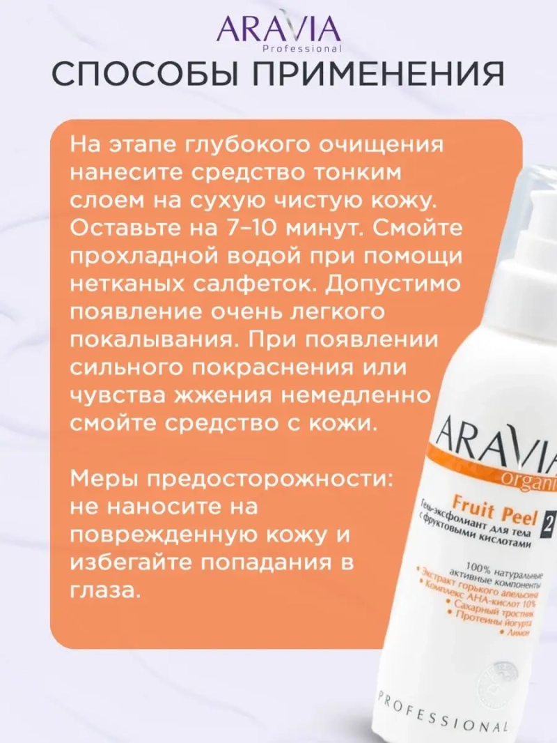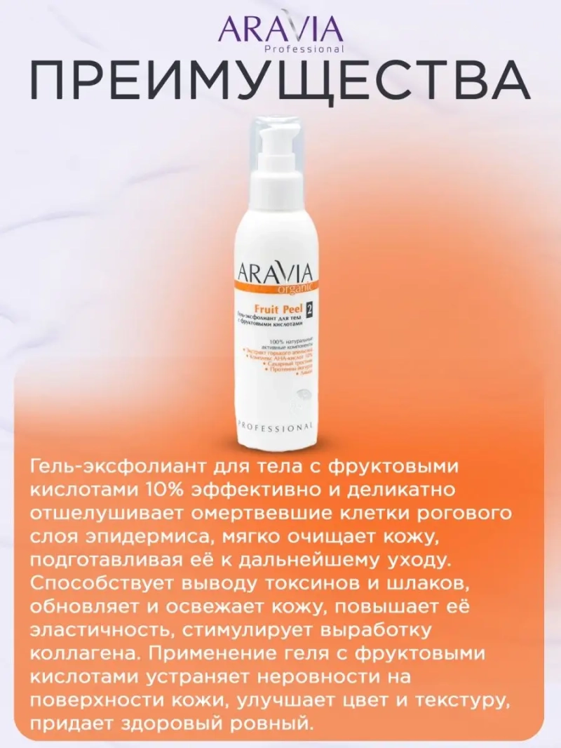 ГЕЛЬ-ЭКСФОЛИАНТ ДЛЯ ТЕЛА С ФРУКТОВЫМИ КИСЛОТАМИ FRUIT PEEL, 150 МЛ. Гель-эксфолиант для тела с фруктовыми кислотами 10% эффективно и деликатно отшелушивает омертвевшие клетки рогового слоя эпидермиса, мягко очищает кожу, подготавливая её к дальнейшему уходу. Способствует выводу токсинов и шлаков, обновляет и освежает кожу, повышает её эластичность, стимулирует выработку коллагена. Применение геля с фруктовыми кислотами устраняет неровности на поверхности кожи, улучшает цвет и текстуру, придает здоровый ровный оттенок. Служит проводником для активных веществ, содержащихся в косметических средствах при последующем интенсивном уходе за кожей. Оптимальный рН 3,5 обеспечивает отсутствие травмирующего эффекта на кожу. Назначение: пилинг, глубокое очищение кожи, для дряблой атоничной кожи, в том числе в области груди, шеи, декольте, живота, внутренней поверхности бедер. Рекомендации для использования: применять при дряблой атоничной коже, в том числе в области груди, шеи, декольте, живота, внутренней поверхности бедер; при гиперкератозе; в Anti-age программах. Биоактивный состав: комплекс АНА-кислот 10% (гликолевая, молочная, лимонная), экстракт горького апельсина. Состав продукта (INCI): Aqua, Glycolic Acid, Lactic Acid, Citric Acid, Hydroxyethylcellulose, Sodium Hydroxide, Organic Citrus Aurantium Dulcis Fruit Extract, Parfum, Benzyl Alcohol (and) Ethylhexylglycerin, Iodopropynyl Butylcarbamate. СПОСОБ ПРИМЕНЕНИЯ: На этапе глубокого очищения нанесите средство тонким слоем на сухую чистую кожу. Оставьте на 7–10 минут. Cмойте прохладной водой при помощи нетканых салфеток. Допустимо появление очень легкого покалывания. При появлении сильного покраснения или чувства жжения немедленно смойте средство с кожи. Меры предосторожности: не наносите на поврежденную кожу и избегайте попадания в глаза. При попадании в глаза тщательно промойте водой. Перед применением тестируйте на небольшом участке кожи.