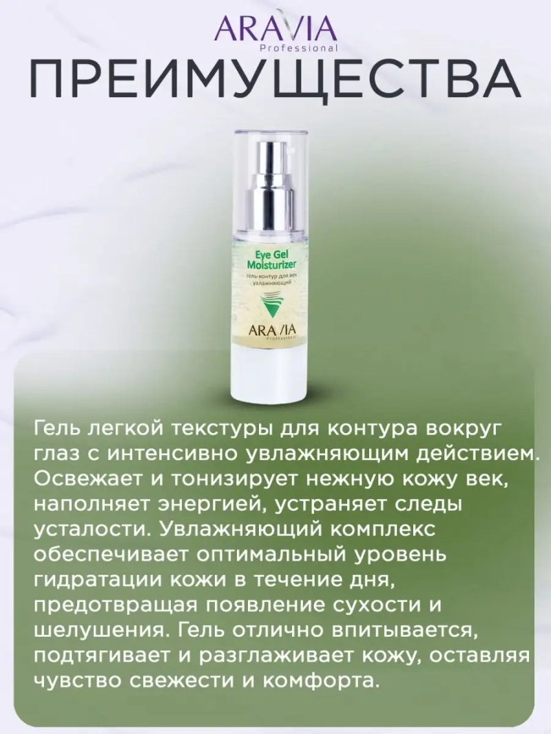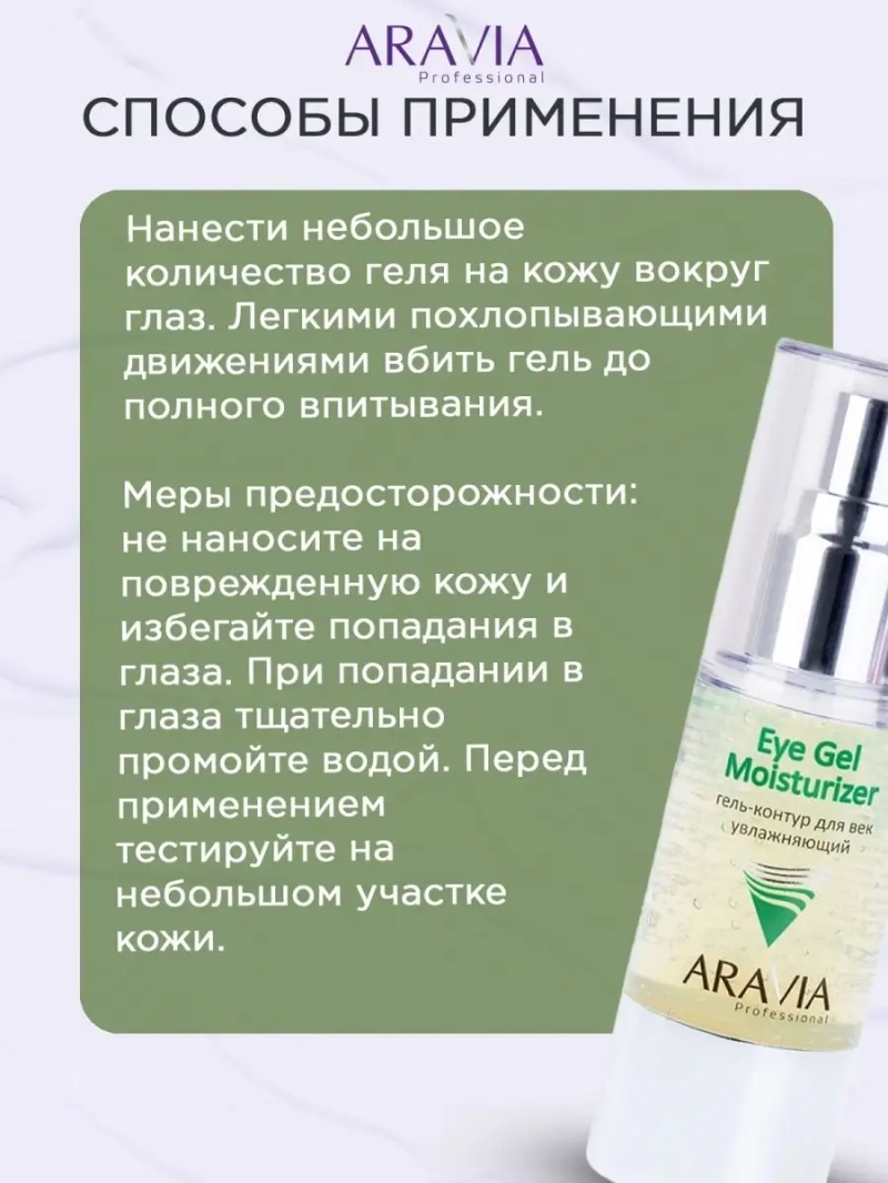 ГЕЛЬ-КОНТУР ДЛЯ ВЕК УВЛАЖНЯЮЩИЙ EYE GEL MOISTURIZER, 30 МЛ. Гель легкой текстуры для контура вокруг глаз с интенсивно увлажняющим действием. Освежает и тонизирует нежную кожу век, наполняет энергией, устраняет следы усталости. Увлажняющий комплекс обеспечивает оптимальный уровень гидратации кожи в течение дня, предотвращая появление сухости и шелушения. Гель отлично впитывается, подтягивает и разглаживает кожу, оставляя чувство свежести и комфорта. Назначение: уход за кожей вокруг глаз. Рекомендации для использования: Домашний уход: рекомендуется использовать ежедневно с утра. ДЕЙСТВИЕ:Увлажняющее, лимфодренажное, тонизирующее, выравнивающее, уменьшает отечность. Биоактивный состав: гидроксиэтилмочевина, гиалуроновая кислота, троксерутин. Состав продукта (INCI): Aqua, Propylenglycol, Hydroxyethyl Urea, Ammonium Acryloyldimethyltaurate/VP Copolymer, Sodium Hyaluronate, Troxerutin, Ethylhexylglycerin, Phenoxyethanol, PEG—12 Dimethicone, PEG 40 Hydrogenated Castor Oil, Parfum. СПОСОБ ПРИМЕННЕНИЯ: Нанести небольшое количество геля на кожу вокруг глаз. Легкими похлопывающими движениями вбить гель до полного впитывания. Меры предосторожности: не наносите на поврежденную кожу и избегайте попадания в глаза. При попадании в глаза тщательно промойте водой. Перед применением тестируйте на небольшом участке кожи.