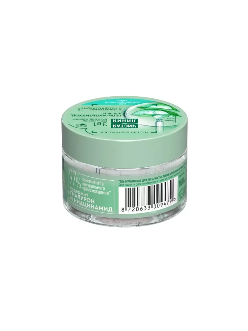 Гель-мультиуход Чистая Линия разработан специально для комбинированной кожи, имеет легкую, приятную консистенцию, которая быстро впитывается, увлажняя кожу. В составе продукта 97% компонентов натурального происхождения*. Содержит активные компоненты: гиалурон и ниацинамид. Гель-мультиуход может быть использован как крем, маска и база под макияж. *компоненты натурального происхождения отмечены в составе на упаковке.
