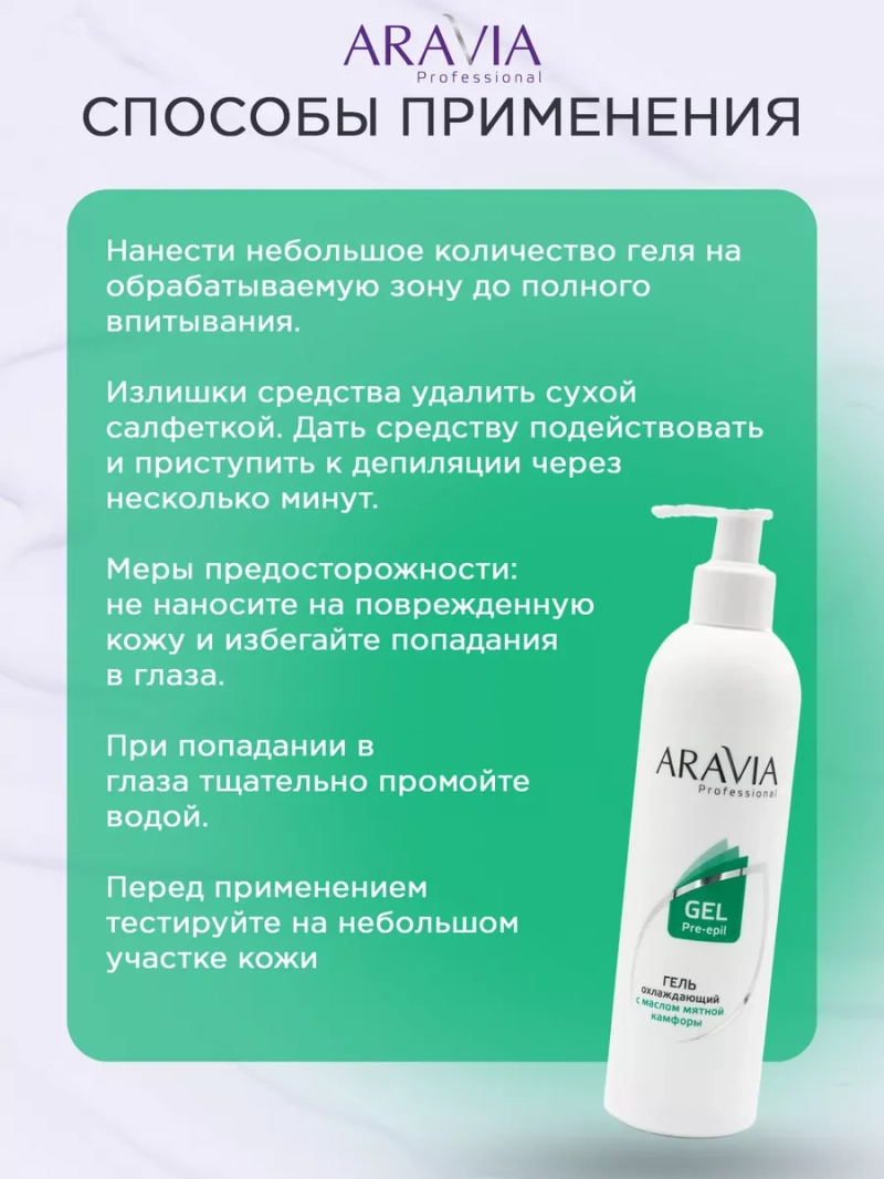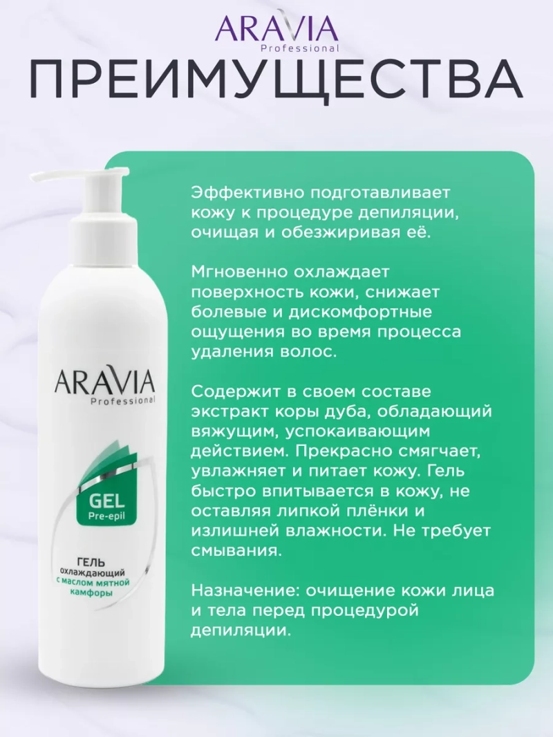ГЕЛЬ ОХЛАЖДАЮЩИЙ ПЕРЕД ДЕПИЛЯЦИЕЙ С МАСЛОМ МЯТНОЙ КАМФОРЫ, 300 МЛ. Эффективно подготавливает кожу к процедуре депиляции, очищая и обезжиривая её. Мгновенно охлаждает поверхность кожи, снижает болевые и дискомфортные ощущения во время процесса удаления волос. Содержит в своем составе экстракт коры дуба, обладающий вяжущим, успокаивающим действием. Прекрасно смягчает, увлажняет и питает кожу. Гель быстро впитывается в кожу, не оставляя липкой плёнки и излишней влажности. Не требует смывания. Биоактивный состав: экстракт коры дуба, экстракт корня солодки, масло мяты, мятная камфора. Состав продукта (INCI): Aqua, Glycerin, Quercus Robur Bark Extract, Glycyrrhiza Glabra (Licorice) Root Extract, Propylene Glycol, Acrylates/C10-30 Alkyl Acrylate Crosspolymer, Triethanolamine, Mentha Piperita (Peppermint) Oil, Peppermint Camphor, DMDM Hydantoin, Iodopropynyl Butylcarbamate, CI 47005. Назначение: очищение кожи лица и тела перед процедурой депиляции. Рекомендации для использования: для профессионального использования. СПОСОБ ПРИМЕНЕНИЯ: Средство предназначено для профессионального использования. Обильно нанесите минерализованную воду на кожу. Проведите очищение кожи от сахарной пасты при помощи нетканой салфетки. При использовании на коже лица нанесите средство непосредственно на салфетку и проведите очищение. Меры предосторожности: не наносите на поврежденную кожу и избегайте попадания в глаза. При попадании в глаза тщательно промойте водой. Перед применением тестируйте на небольшом участке кожи