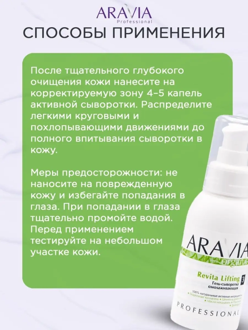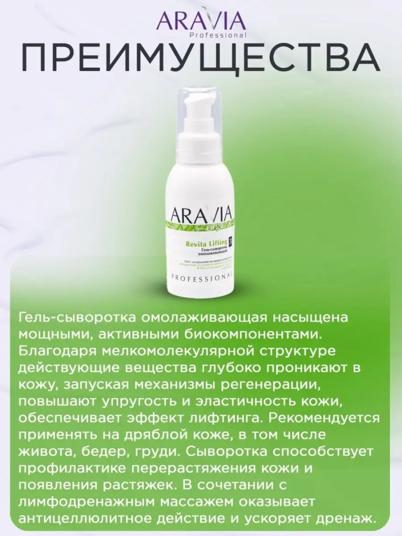 ГЕЛЬ-СЫВОРОТКА ОМОЛАЖИВАЮЩАЯ REVITA LIFTING, 100 МЛ. Гель-сыворотка омолаживающая насыщена мощными, активными биокомпонентами. Благодаря мелкомолекулярной структуре действующие вещества глубоко проникают в кожу, запуская механизмы регенерации, повышают упругость и эластичность кожи, обеспечивает эффект лифтинга. Рекомендуется применять на дряблой коже, в том числе живота, бедер, груди. Сыворотка способствует профилактике перерастяжения кожи и появления растяжек. В сочетании с лимфодренажным массажем оказывает антицеллюлитное действие и ускоряет дренаж. Назначение: для процедур обертывания, массажа, аппаратных методик, в качестве регулярного поддерживающего ухода при наличии показаний. Рекомендации для использования: Профессиональный уход: проведение салонных процедур на этапе интенсивного ухода: перед обертыванием, массажем. Может применяться в аппаратных процедурах. Домашний уход: в качестве регулярного поддерживающего ухода при проблемах: дряблая атоничная кожа, в том числе в области груди, шеи, декольте, живота, внутренней поверхности бедер, стрии. ДЕЙСТВИЕ: укрепляющее, увлажняющее, регенерирующее, омолаживающее, лифтинговое. Биоактивный состав: гидролизат коллагена, центелла азиатская, масло макадамии, грейпфрут, гель алоэ вера, зеленый чай, конский каштан, софора японская, витамин С. Экстракт грейпфрута способствует снижению проявлений целлюлита, выравнивает поверхность кожи, разглаживает её. Комплекс экстрактов конского каштана, софоры японской и витамина С благотворно влияет на состояние капилляров кожи, способствуя замедлению процесса развития капилляропатий. Органический гель алоэ вера и экстракт зеленого чая глубоко увлажняют кожу и придают свежий вид. СПОСОБ ПРИМЕНЕНИЯ: После тщательного глубокого очищения кожи нанесите на корректируемую зону 4–5 капель активной сыворотки. Распределите легкими круговыми и похлопывающими движениями до полного впитывания сыворотки в кожу. Меры предосторожности: не наносите на поврежденную кожу и избегайте попадания в глаза