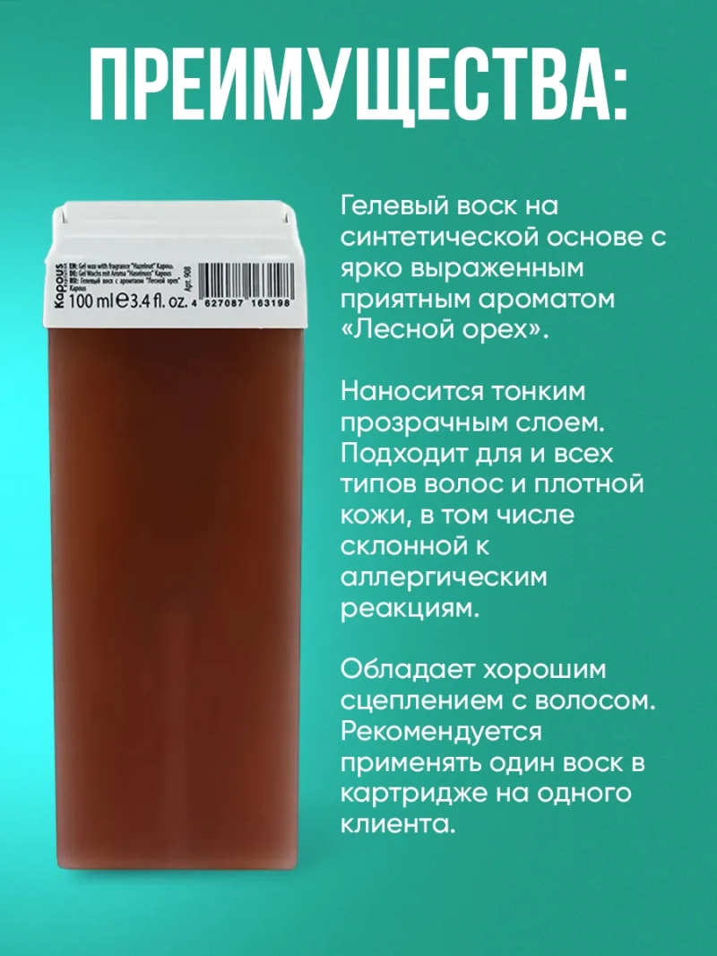 Гелевый воск с ароматом Лесной орех - непревзойденное средство для эффективной депиляции и ухода за кожей, представленное на маркетплейсе WILDBERRIES. Чтобы выглядеть привлекательно и уверенно в любой ситуации, важно следить за гладкостью вашей кожи, и этот гелевый воск с ароматом Лесной орех справится с этой задачей на ура!Одним из ключевых преимуществ этого продукта является его состав на основе синтетической основы и высококачественных экстрактов. Гелевый воск наносится тонким прозрачным слоем и успешно справится с любыми типами волос и плотной кожей. Он даже подходит для людей со склонностью к аллергическим реакциям, благодаря специально разработанной формуле.Высокое сцепление с волосом обеспечивает быстрое и эффективное удаление даже самых коротких и жестких волос. Ваша кожа станет гладкой и нежной после каждой депиляции с гелевым воском Лесной орех.Специалисты рекомендуют использовать один воск в картридже для каждого клиента, чтобы достичь наилучших результатов. Состав продукта безопасен и не вызывает раздражения или покраснений кожи.Применение гелевого воска Лесной орех - это просто! Вставьте картридж с воском в специальное устройство и через несколько минут воск будет готов к использованию. Нанесите его на желаемую область кожи в направлении роста волос и накройте бумагой для депиляции. После остывания воска, резким движением снимите бумагу против роста волос, и вы получите гладкую кожу без лишних волос!Этот гелевый воск с ароматом Лесной орех - идеальное решение для домашней и профессиональной депиляции. Заняться ею теперь будет не только эффективно, но и приятно благодаря нежному аромату Лесной орех, который окружит вас своей атмосферой и добавит вам уверенности на протяжении всего дня.Чтобы заботиться о себе и своей коже стало проще и эффективнее, выбирайте гелевый воск с ароматом Лесной орех на маркетплейсе WILDBERRIES! Получите истинное удовольствие от каждой депиляции и наслаждайтесь гладкой, шелковистой кожей каждый день!