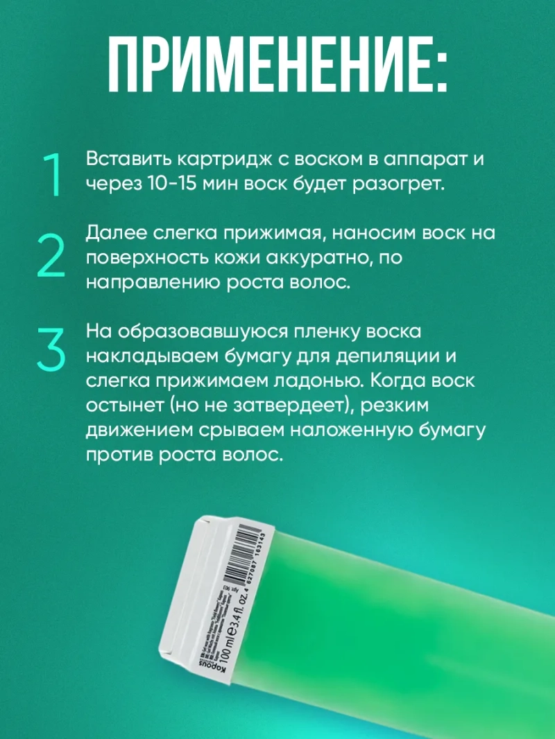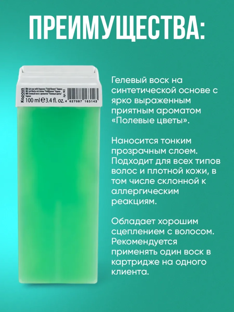 Гелевый воск с ароматом и экстрактами - это идеальное решение для достижения идеально гладкой кожи и уверенности в себе. Этот эксклюзивный продукт, разработанный на основе синтетических компонентов, помогает вам стать обладательницей безупречного результата депиляции. Гелевый воск с ароматом Полевые цветы не только удаляет нежелательные волосы, но и создает атмосферу уюта и релаксации благодаря своему ярко выраженному приятному аромату. Высококачественная формула гелевого воска позволяет легко наносить тонкий и прозрачный слой на поверхность кожи, обеспечивая отличное сцепление с волосами, что делает процедуру депиляции максимально эффективной. Подходит для всех типов волос и плотной кожи, даже для тех, кто склонен к аллергическим реакциям, что делает его универсальным и удобным в использовании. Картридж с гелевым воском содержит достаточное количество продукта для одной процедуры, что делает его экономичным. Безопасные ингредиенты, такие как Hydrogenated Styrene/Methyl Styrene/Indene Copolymer, Ethylene/VA Copolymer и другие, обеспечивают мягкое и эффективное удаление волос без риска повреждения кожи. Применение гелевого воска также не требует особых усилий. Просто вставьте картридж в специальный аппарат, подождите 10-15 минут до полного разогрева воска, и аккуратно нанесите его на кожу в направлении роста волос. После этого накройте наложенный воск специальной бумагой для депиляции и слегка прижмите ладонью. Когда воск остынет, резким движением снимите бумагу против роста волос. Доверившись нашему гелевому воску с ароматом Полевые цветы, вы сможете насладиться идеальной гладкостью кожи и ощущением комфорта. Закажите его уже сегодня и откройте для себя радость безупречного результата депиляции, который придаст вам уверенность в своей привлекательности.