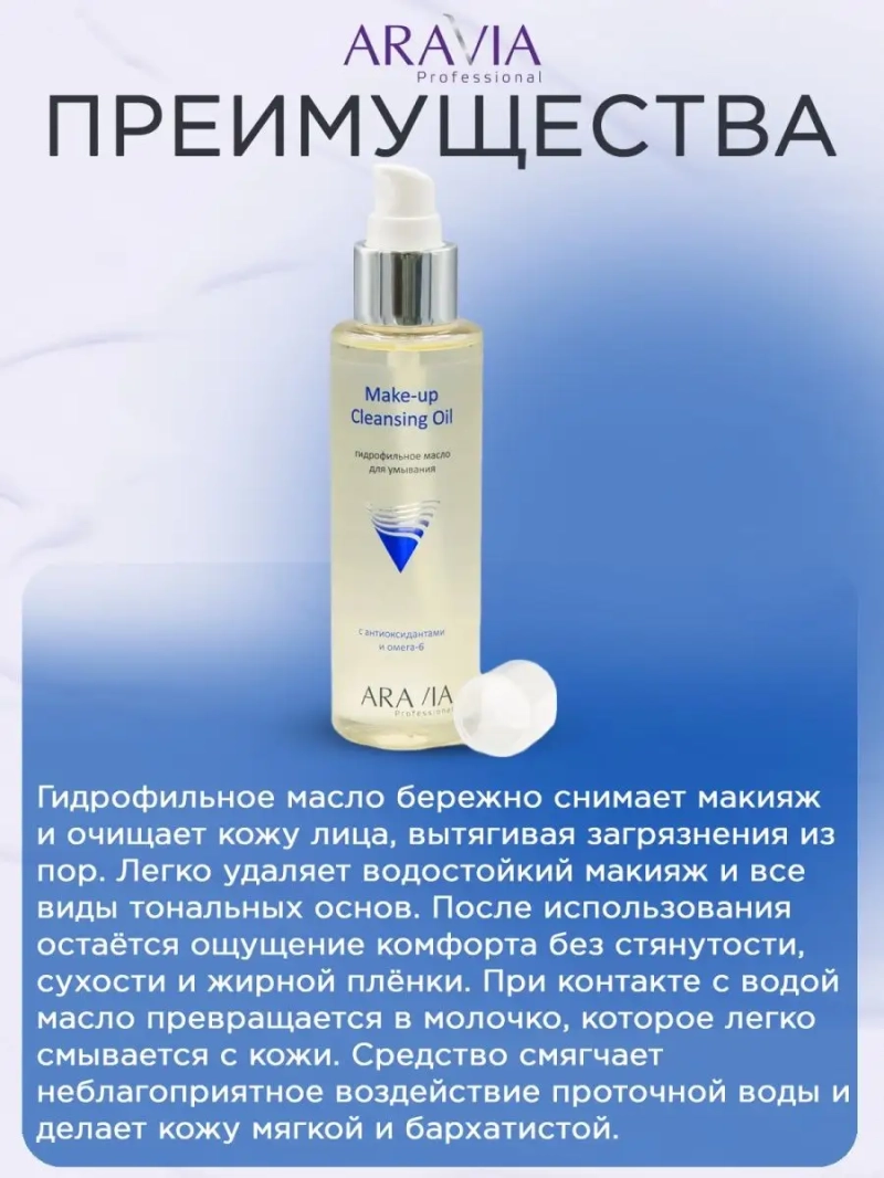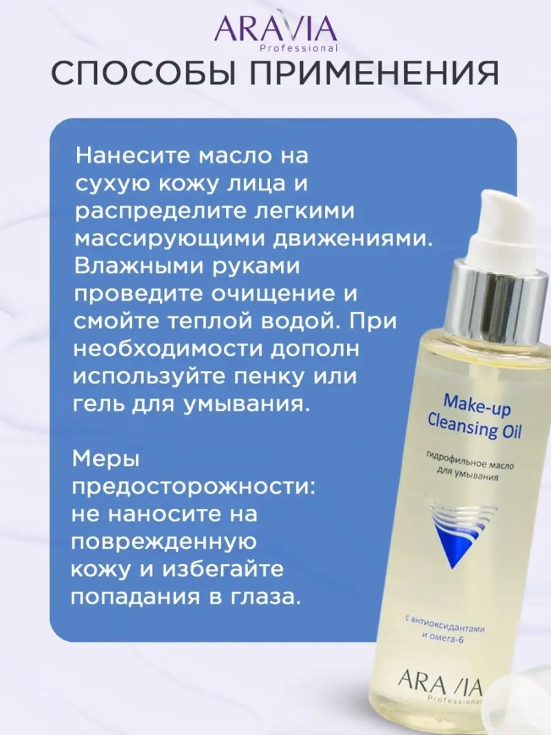 ГИДРОФИЛЬНОЕ МАСЛО ДЛЯ УМЫВАНИЯ С АНТИОКСИДАНТАМИ И ОМЕГА-6 MAKE-UP CLEANSING OIL, 110 МЛ. Гидрофильное масло бережно снимает макияж и очищает кожу лица, вытягивая загрязнения из пор. Легко удаляет водостойкий макияж и все виды тональных основ. После использования остаётся ощущение комфорта без стянутости, сухости и жирной плёнки. При контакте с водой масло превращается в молочко, которое легко смывается с кожи. Средство смягчает неблагоприятное воздействие проточной воды и делает кожу мягкой и бархатистой. Назначение: снятие макияжа и очищение кожи. Рекомендации для использования: Домашний уход: ежедневное использование 1 раз в день. Биоактивный состав: масло подсолнечника, масло виноградной косточки, витамин Е. Состав продукта (INCI): Helianthus Annuus (Sunflower) Seed Oil, Cyclopentasiloxane, Isopropyl Isostearate, Ethylhexyl stearate, PEG-20 Glyceryl Triisostearate, Vitis Vinifera (Grape) Seed Oil, Tocopheryl Acetate, Parfume. СПОСОБ ПРИМЕННЕНИЯ: Нанесите масло на сухую кожу лица и распределите легкими массирующими движениями. Влажными руками проведите очищение и смойте теплой водой. При необходимости дополнительно используйте пенку или гель для умывания. Меры предосторожности: не наносите на поврежденную кожу и избегайте попадания в глаза. При попадании в глаза тщательно промойте водой. Перед применением тестируйте на небольшом участке кожи.