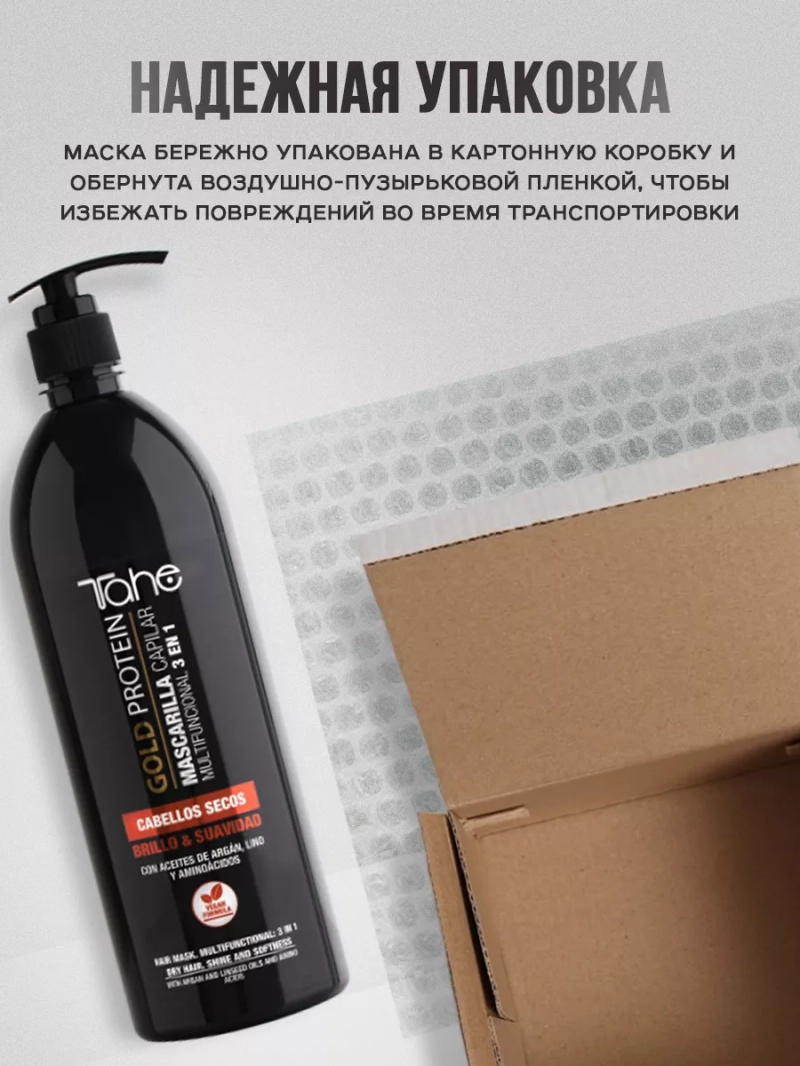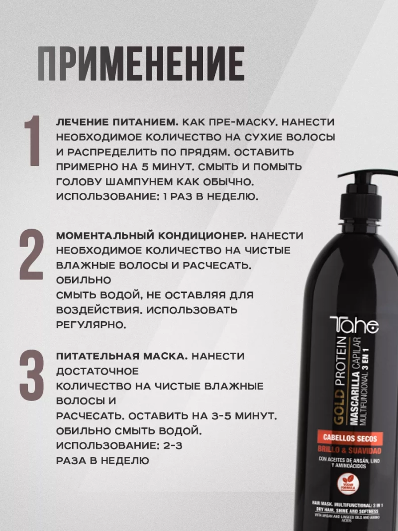 Профессиональная маска для сухих волос 3 в 1 Gold Protein Hair Mask Multifunctional 3 in 1 Dry hair. Shine and softness от бренда Tahe - невероятно эффективная маска, которая обеспечивает комплексный уход за волосами. Натуральная маска для роста волос на голове была разработана специально для тех, кто страдает от сухости и ломкости волос.