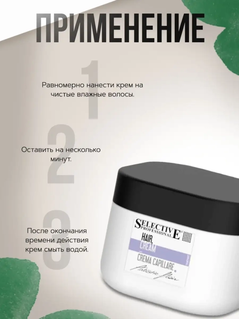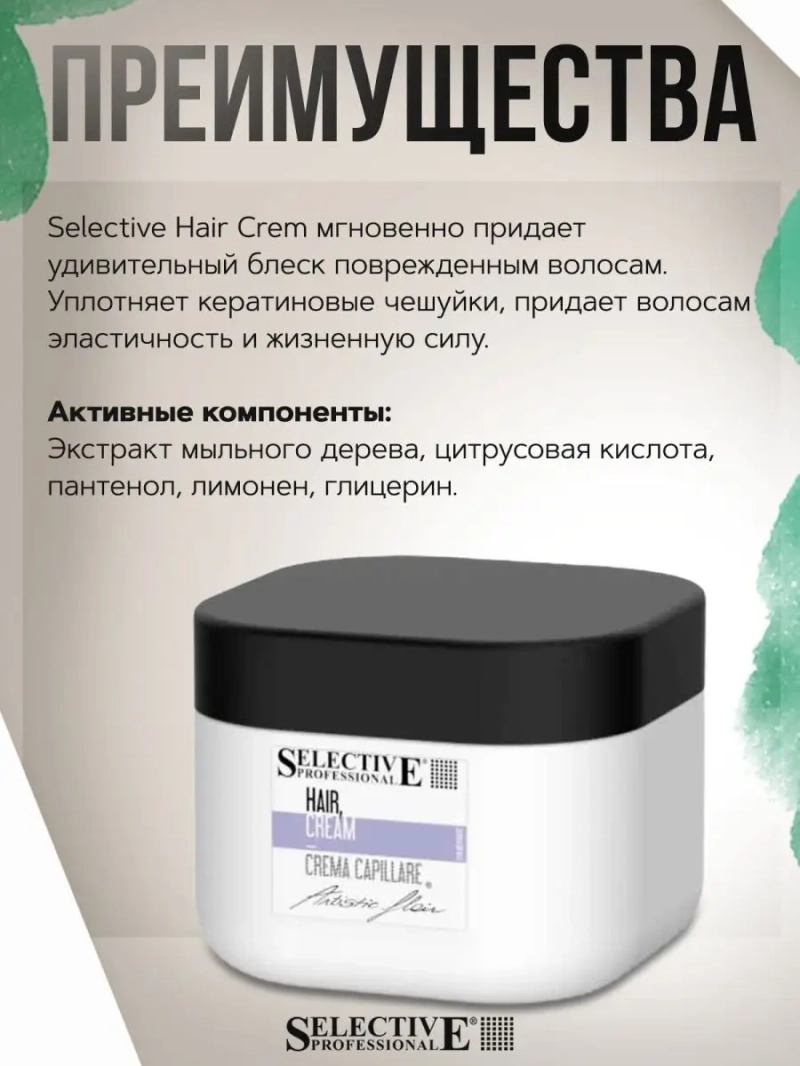 Selective Professional Artistic Flair Hair Cream Кондиционирующий крем для всех типов волос, 500 мл. Hair Cream - Кондиционирующий крем Крем Selective Hair Crem идеален для пористых волос, увлажняет их и улучшает расчесывание волос. Selective Hair Crem мгновенно придает удивительный блеск поврежденным волосам. Уплотняет кератиновые чешуйки, придает волосам эластичность и жизненную силу. Активные компоненты: Экстракт мыльного дерева, цитрусовая кислота, пантенол, лимонен, глицерин.;Способ применения: Крем наносится на чистые пряди сразу после мытья волос. Отступите несколько сантиметров от корней и распределите средство по всей длине. Спустя 3-5 минут смойте большим количеством теплой проточной воды. Результат: Hair Crem от Селектив мгновенно придает удивительный блеск поврежденным волосам. Уплотняет кератиновые чешуйки, придает волосам эластичность и жизненную силу. Эффект: восстановление, облегчение расчесывания, придание блеска, придание эластичности, увлажнение, уплотнение волос. Способ применения: равномерно нанести крем на чистые влажные волосы. Оставить на несколько минут. После окончания времени экспозиции крем смыть водой. Состав: aqua, propylene glycol, myristyl alcohol, cetrimonium chloride, parfum, dmdm hydantoin, hexyl cinnamal, alpha-isomethyl ionone, linalool, limonene, citric acid
