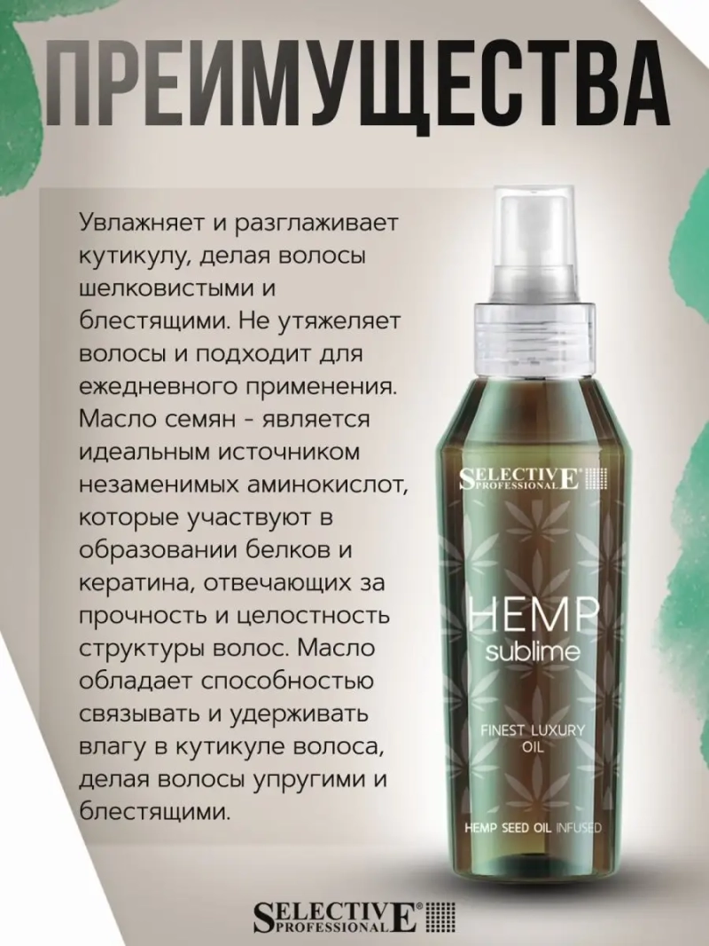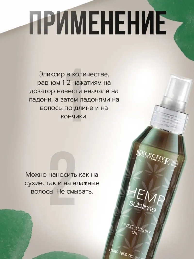 Восстанавливающий эликсир с маслом для всех типов волос Selective Hemp Sublime Ultimate Luxury Elixir 100 мл. Эликсир здоровья для всех типов волос HEMP SUBLIME интенсивно восстанавливает сухие и сильно поврежденные волосы. Увлажняет и разглаживает кутикулу, делая волосы шелковистыми и блестящими. Не утяжеляет волосы и подходит для ежедневного применения. Масло семян - является идеальным источником незаменимых аминокислот, которые участвуют в образовании белков и кератина, отвечающих за прочность и целостность структуры волос. Масло обладает способностью связывать и удерживать влагу в кутикуле волоса, делая волосы упругими и блестящими. Восстанавливает идеальный баланс увлажнения волос и кожи головы. Регулирует работу сальных желез, восстанавливает защитную функцию и ускоряет регенерацию кожи головы. Способ применения: эликсир в количестве, равном 1-2 нажатиям на дозатор (в зависимости от длины волос) нанести вначале на ладони, а затем ладонями на волосы по длине и на кончики. Можно наносить как на сухие, так и на влажные волосы. Не смывать. Максимальный эффект восстановления и увлажнения волос достигается при совместном применении с другими продуктами линии Hemp Sublime. Состав: CYCLOPENTASILOXANE, DIMETHICONE, SATIVA (HEMP), SEED OIL OIL, PARFUM, LIMONENE, HYDROXYCITRONELLAL, HEXYL CINNAMAL, LINALOOL, COUMARIN, CITRONELLOL