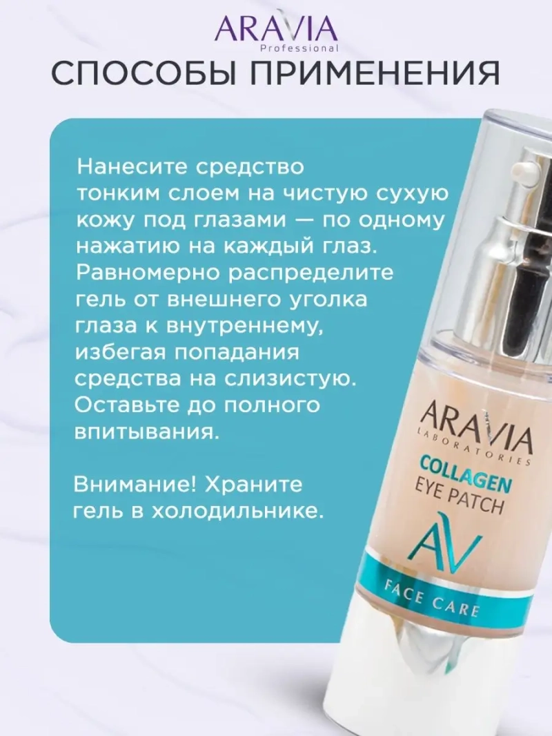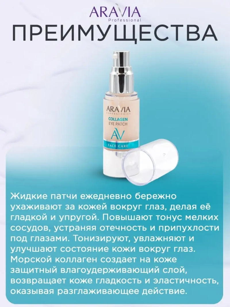 ЖИДКИЕ КОЛЛАГЕНОВЫЕ ПАТЧИ COLLAGEN EYE PATCH, 30 МЛ. Жидкие патчи ежедневно бережно ухаживают за кожей вокруг глаз, делая её гладкой и упругой. Повышают тонус мелких сосудов, устраняя отечность и припухлости под глазами. Тонизируют, увлажняют и улучшают состояние кожи вокруг глаз. Морской коллаген создает на коже защитный влагоудерживающий слой, возвращает коже гладкость и эластичность, оказывая разглаживающее действие. Назначение: уход за кожей вокруг глаз. Рекомендации для использования: для ежедневного использования. ДЕЙСТВИЕ: устраняющее отечность, повышает эластичность, увлажняющее, тонизирующее, смягчающее. Биоактивный состав: морской коллаген. Морской коллаген активно используется для борьбы с негативными влияниями окружающей среды. Главное его достоинство — укрепление защитных функций кожи. Он помогает избежать выраженной дряблости кожи, предупреждает образование отеков и припухлостей, способствует увлажнению и возмещению потерь аминокислот в коже, обладает питательным и регенерирующим действием. Более того, коллаген визуально выравнивает рельеф кожи, укрепляет кожу и повышает её упругость. Состав продукта (INCI): Аqua, Polymethylsilsesquioxane, Dimethicone, Isohexadecane, Cetearyl Methicone, PEG-40 Stearate, Steareth-2, Steareth-21, Hydrolyzed Collagen, Glycerin, Phenoxyethanol (and) Ethylhexylglycerin, Ammonium Acryloyldimethyltaurate/VP Copolymer, PEG 40 Hydrogenated Castor Oil, Parfum, CI 16035, CI 19140. СПОСОБ ПРИМЕНЕНИЯ: Нанесите средство тонким слоем на чистую сухую кожу под глазами — по одному нажатию на каждый глаз. Равномерно распределите гель от внешнего уголка глаза к внутреннему, избегая попадания средства на слизистую. Оставьте до полного впитывания. Внимание! Храните гель в холодильнике. Меры предосторожности: не наносите на поврежденную кожу и избегайте попадания в глаза. При попадании в глаза тщательно промойте водой. Перед применением тестируйте на небольшом участке кожи.