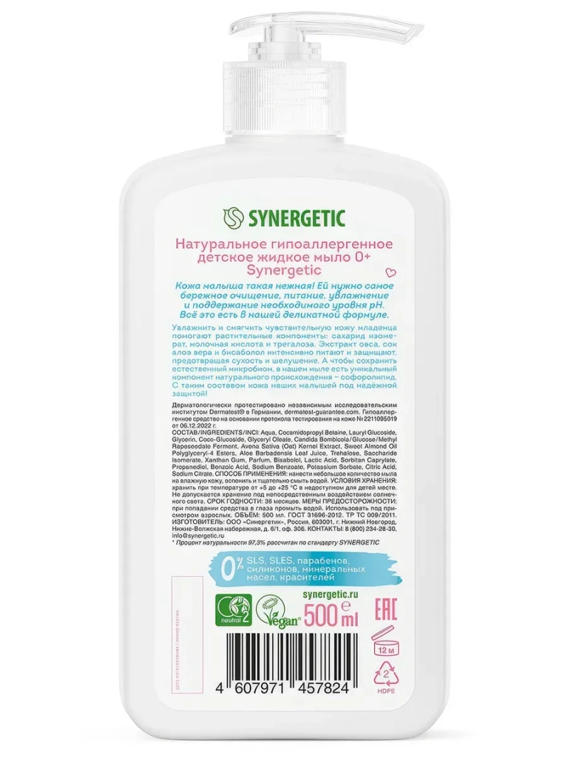 Натуральное гипоаллергенное детское жидкое мыло 0+ SYNERGETIC мягко очищает кожу малыша, сохраняя естественный уровень pH. Мыло хорошо пенится и легко смывается водой. Безопасная, эффективная и гипоаллергенная формула содержит молочную кислоту и пребиотик трегалозу, которые бережно очищают кожу, нормализуют и сохраняют естественный микробиом. Бисаболол успокаивает и помогает восстановить барьерные функции кожи. Софоролипид, защищающий кожу от потери влаги, делает ее более устойчивой к неблагоприятным факторам внешней среды. Экстракт овса – это природный эмолент с выраженными антиоксидантными свойствами, питательный, увлажняющий, защищающий и восстанавливающий естественную среду нежной детской кожи. Сок алоэ вера питает и увлажняет кожу, а масло сладкого миндаля регулирует гидролипидный баланс, предотвращая появление сухости, раздражения и шелушения.