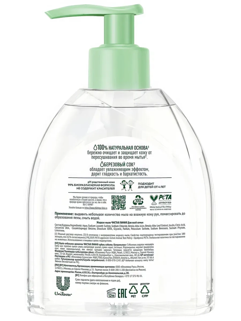 Чистые руки – твоя защита. Чаще мойте руки! Жидкое мыло Чистая линия Для всей семьи Березовое обеспечивает бережный уход за кожей, смягчая и тонизируя ее. Мыло удаляет бактерии, успешно смывая их с поверхности кожи вместе с другими ежедневными загрязнениями. Натуральные компоненты мягко очищают, дарят гладкость и бархатистость. Подходит для детей от 4-х лет. Результат: кожа мягко очищена и увлажнена.