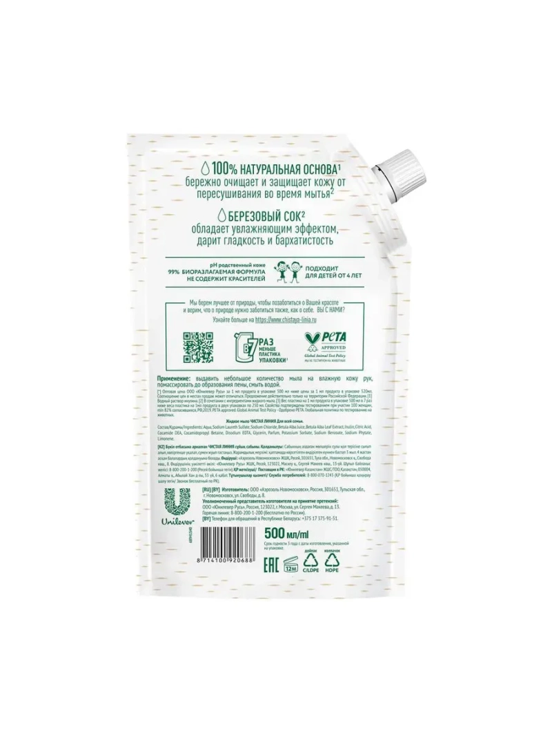 Жидкое мыло Чистая Линия с березовым соком и экстрактом листьев березы – это средство для мытья рук на натуральной основе*. Мыло для рук жидкое защищает кожу от пересушивания во время мытья. Березовый сок, богатый витаминами (С и группы B) и микроэлементами оказывает на кожу увлажняющий эффект. Формула продукта на 99% биоразлагаемая. Мыло не содержит красителей, имеет рН родственный коже. Березовое увлажняющее мыло для всей семьи подходит для детей от 4-х лет. Объем средства – 500 мл. *водный раствор инулина