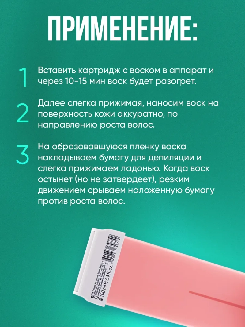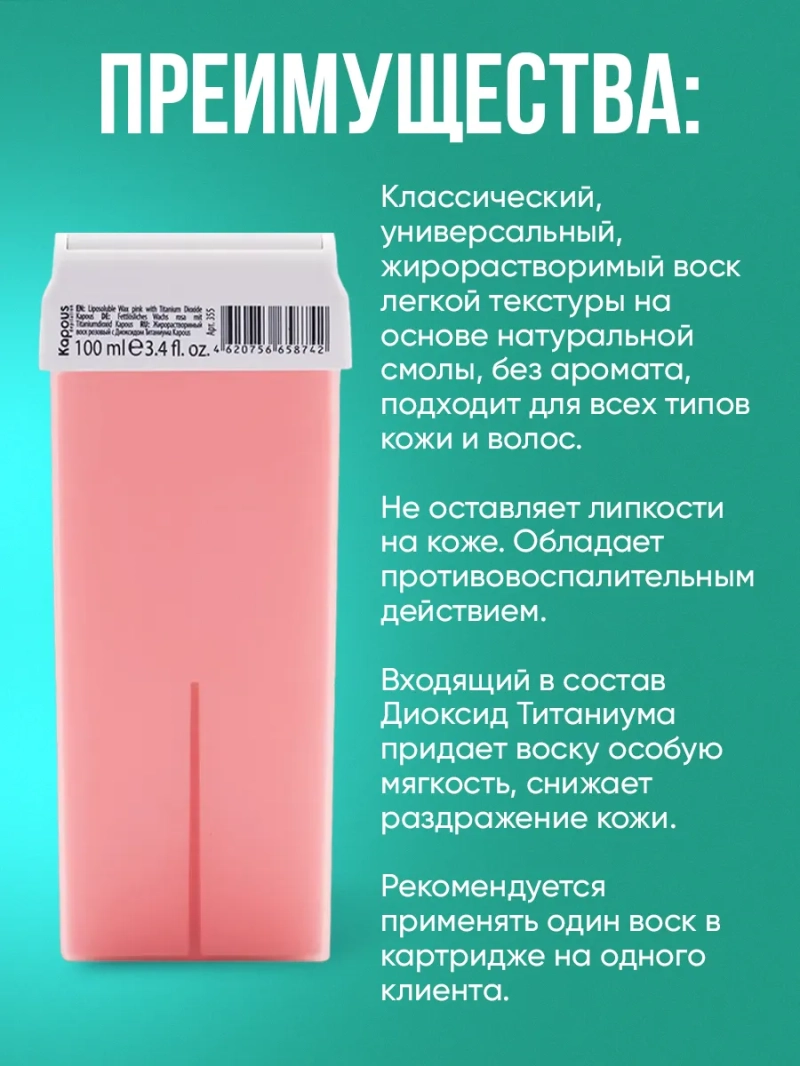 Жирорастворимый воск Розовый с Титаном с широким роликом это идеальное решение для вашей кожи и волос. Он подчеркивает вашу красоту и уверенность, обеспечивая максимальную эффективность и комфорт при процедуре депиляции.Наш классический воск обладает легкой текстурой и нежным ароматом, который не перебивает ваш естественный запах. Благодаря его жирорастворимым свойствам, он проникает глубоко в волосяной фолликул, снимая даже самые короткие и тонкие волоски.Преимущества нашего воска не ограничиваются только его эффективностью. Он также обладает противовоспалительным действием, благодаря наличию Азулена в его составе. Азулен смягчает, увлажняет и успокаивает кожу, предотвращая раздражение и покраснение после процедуры депиляции.Отличительная особенность нашего воска широкий ролик, который обеспечивает равномерное и аккуратное нанесение продукта на кожу. Картридж с воском легко вставляется в аппарат и быстро разогревается, благодаря чему вы экономите время и получаете максимальную удобство во время процедуры.Применение воска очень просто. Вам нужно лишь нанести его на поверхность кожи аккуратными движениями в направлении роста волос. Затем накладываем специальную бумагу для депиляции на пленку воска и немного прижимаем. Когда воск остынет, но не затвердеет, резким движением срываем бумагу против роста волос, удаляя волоски из корней безболезненно и эффективно.Наш жирорастворимый воск подходит для всех типов кожи и волос и идеален для профессионального использования: один картридж хватает на одного клиента. Безупречное качество, удобство применения и отличный результат вот то, что делает наш воск лидером на рынке депиляционных средств.Оставьте позади нежелательные волоски и неприятные ощущения от депиляции. Попробуйте жирорастворимый воск Розовый с Титаном с широким роликом и наслаждайтесь гладкой, ухоженной кожей каждый день. Закажите прямо сейчас и получите надежную и эффективную депиляцию, которая подарит вам уверенность и радость!