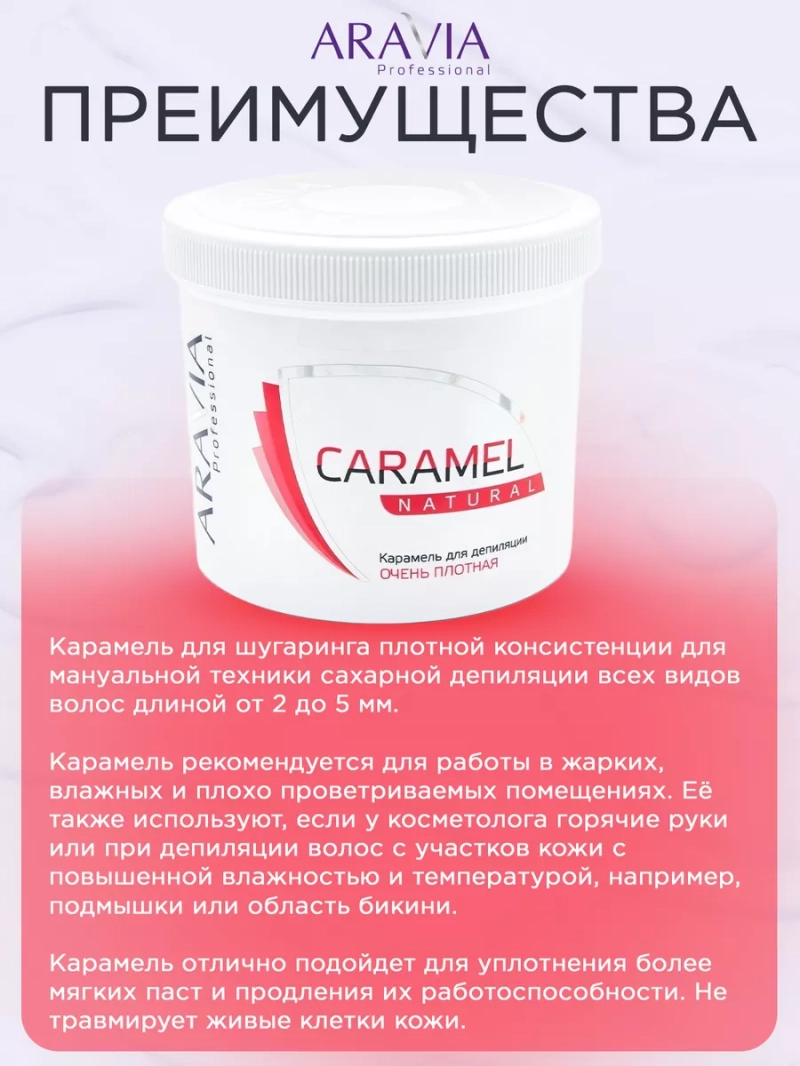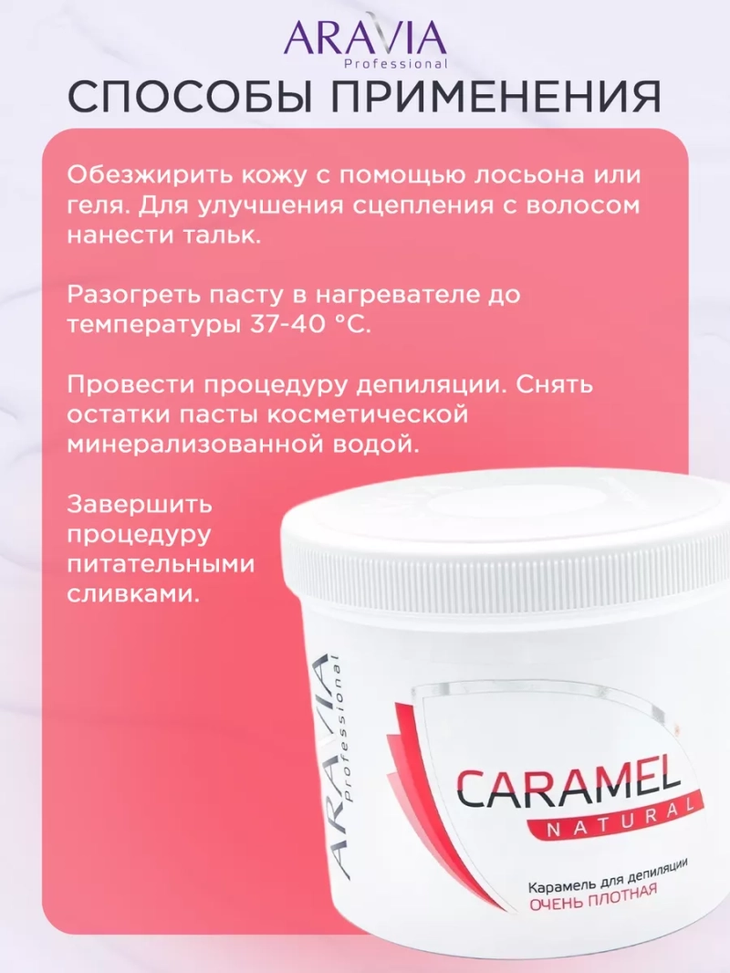 КАРАМЕЛЬ ДЛЯ ШУГАРИНГА «НАТУРАЛЬНАЯ», 750 Г. Карамель для шугаринга очень плотной консистенции используется для мануальной техники, подходит для удаления всех видов волос длиной от 2 до 5 мм. Карамель более устойчивая к влажности и высокой температуре поэтому, рекомендуется для работы в жарких, влажных и плохо проветриваемых помещениях. Её также используют, если у косметолога горячие руки или при депиляции волос с участков кожи с повышенной влажностью и температурой, например, подмышки или область бикини. Карамель отлично подойдет для уплотнения более мягких паст и продления их работоспособности. Не травмирует живые клетки кожи. СПОСОБ ПРИМЕНЕНИЯ: Обезжирить кожу с помощью лосьона или геля. Для улучшения сцепления с волосом нанести тальк. Разогреть пасту в нагревателе до температуры 37-40 °C. Провести процедуру депиляции. Снять остатки пасты косметической минерализованной водой. Завершить процедуру питательными сливками. Меры предосторожности: не наносите на поврежденную кожу и избегайте попадания в глаза. При попадании в глаза тщательно промойте водой. Перед применением тестируйте на небольшом участке кожи.