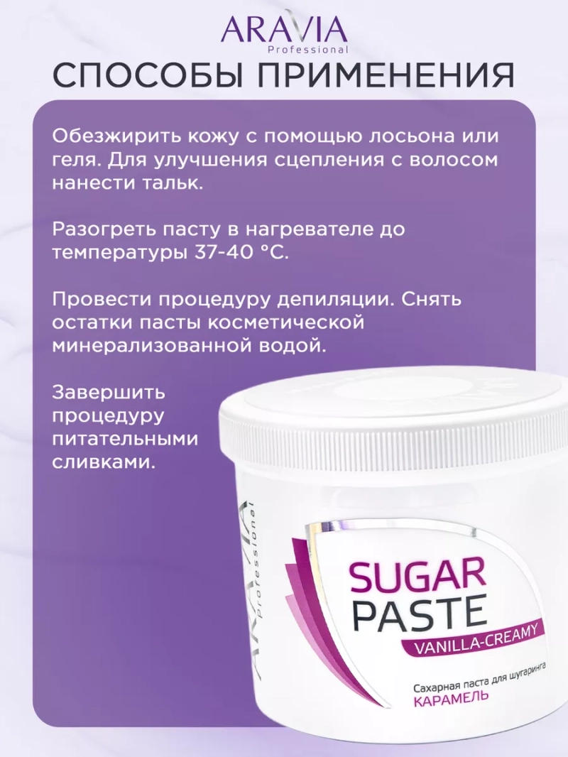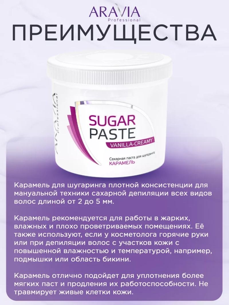 КАРАМЕЛЬ ДЛЯ ШУГАРИНГА «ВАНИЛЬНО-СЛИВОЧНАЯ», 750 Г. Карамель для шугаринга плотной консистенции для мануальной техники сахарной депиляции всех видов волос длиной от 2 до 5 мм. Карамель рекомендуется для работы в жарких, влажных и плохо проветриваемых помещениях. Её также используют, если у косметолога горячие руки или при депиляции волос с участков кожи с повышенной влажностью и температурой, например, подмышки или область бикини. Карамель отлично подойдет для уплотнения более мягких паст и продления их работоспособности. Не травмирует живые клетки кожи. СПОСОБ ПРИМЕНЕНИЯ: Обезжирить кожу с помощью лосьона или геля. Для улучшения сцепления с волосом нанести тальк. Разогреть пасту в нагревателе до температуры 37-40 °C. Провести процедуру депиляции. Снять остатки пасты косметической минерализованной водой. Завершить процедуру питательными сливками. Меры предосторожности: не наносите на поврежденную кожу и избегайте попадания в глаза. При попадании в глаза тщательно промойте водой. Перед применением тестируйте на небольшом участке кожи.