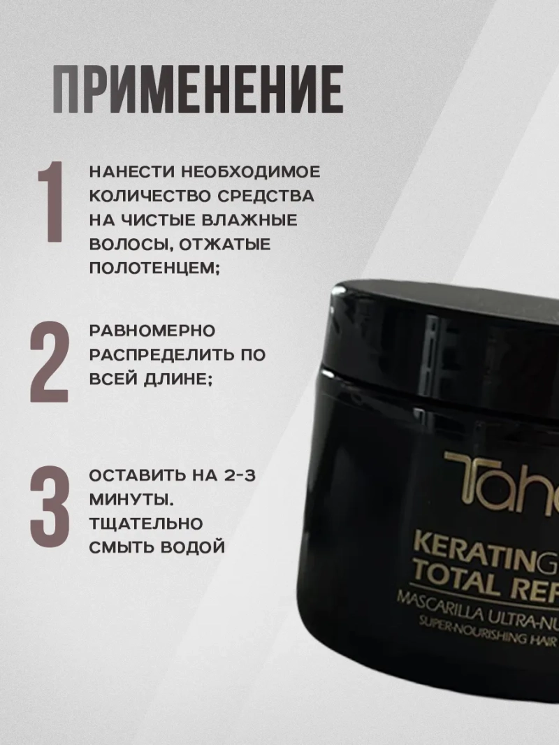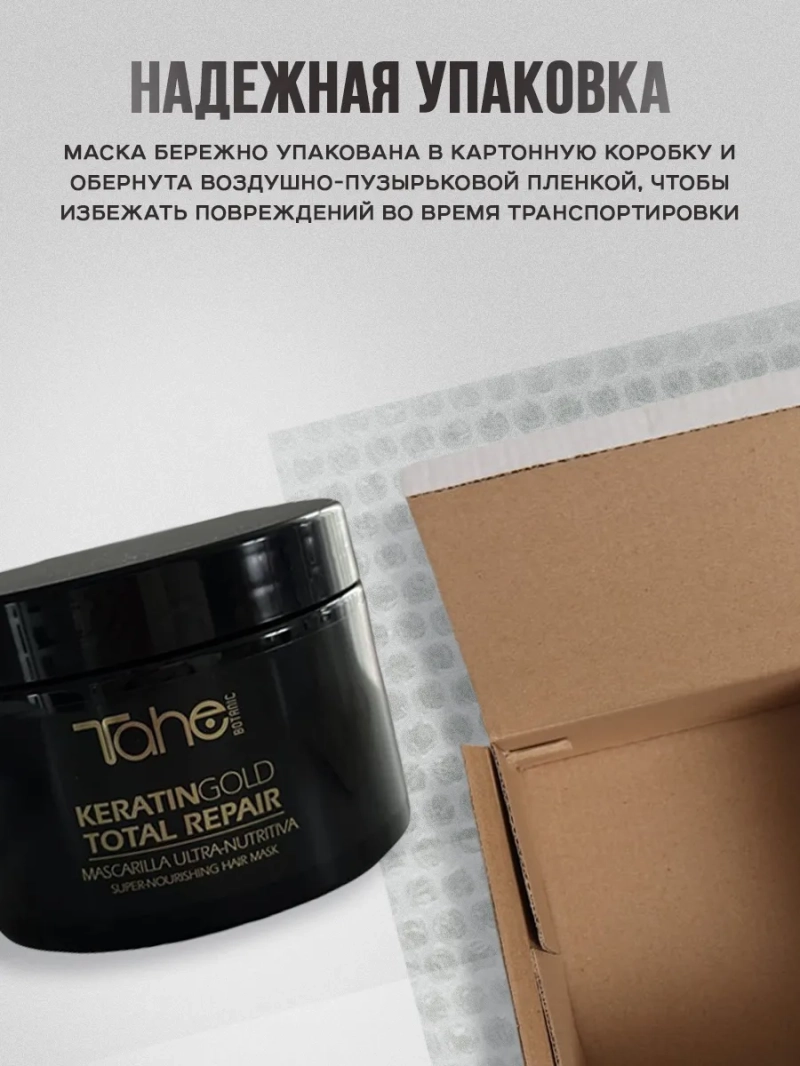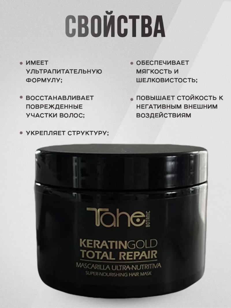 Испанский бренд профессиональной косметики для волос Tahe предлагает настоящий эликсир для ваших локонов - маску Keratin Gold Total Repair с кератином. Универсальная маска – это идеальный выбор для восстановления и укрепления остонченных локонов. Маска стимулирует рост волос и обеспечивает глубокое восстановление от корней до кончиков. Натуральная маска для волос с аргановым маслом моментально впитывается в каждый волос и восстанавливает структуру по всей длине. Маска подходит для окрашенных волос и подчеркивает яркость оттенка. Не вымывает цвет и продлевает стойкость окрашивания. Особые молекулы просачиваются внутрь волоса и заполняют повреждения. После применения кератинового сос - средства сухие и поврежденные волосы будут выглядеть гладкими и аккуратными. Органическая маска защищает пряди от механических и термических воздействий. Помимо восстановления, питательная маска обеспечивает надежную защиту от отрицательного воздействия окружающей среды. Кератин образует невидимую пленку вокруг каждого волоса. Маска защищает от пересыхания и вредного воздействия ультрафиолетовых лучей. В результате ваши волосы будут защищены от повреждений и сохранят ухоженный вид.