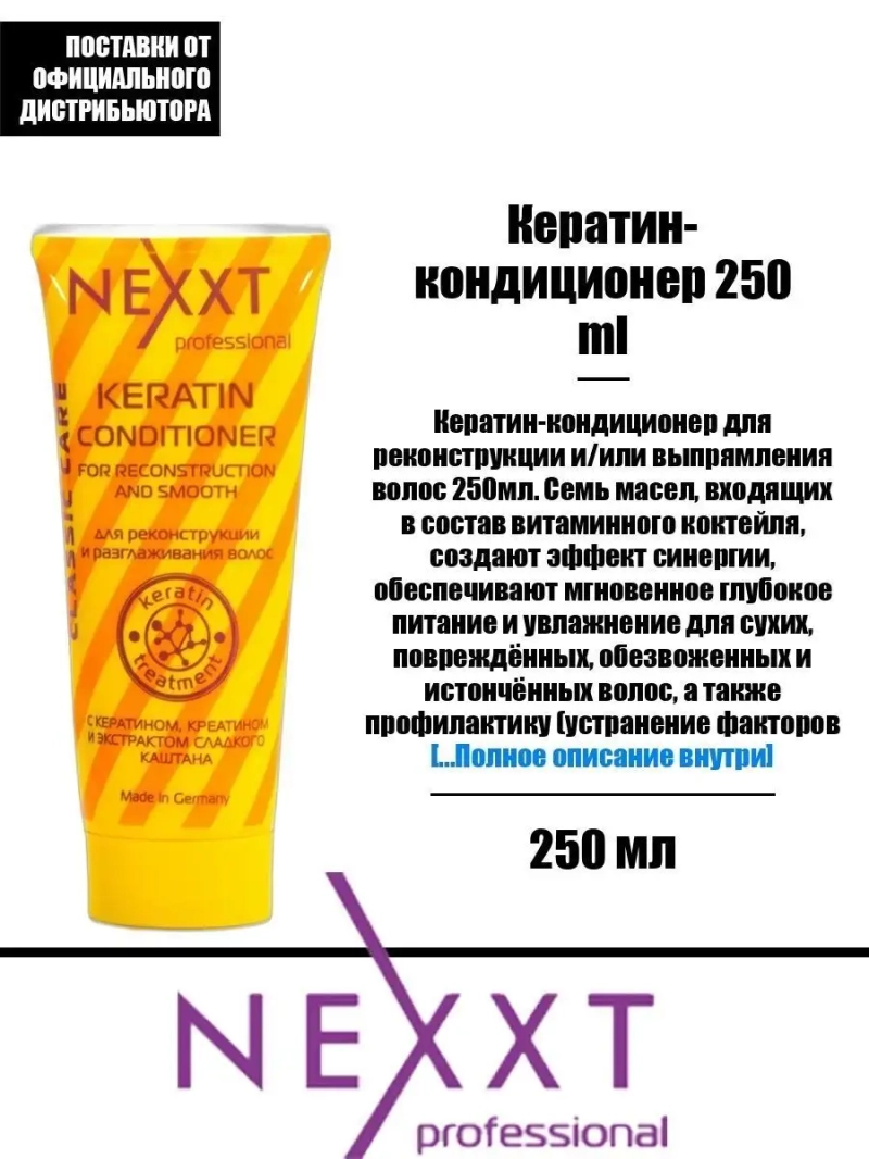 Кератин-кондиционер для реконструкции и/или выпрямления волос 250мл. Семь масел, входящих в состав витаминного коктейля, создают эффект синергии, обеспечивают мгновенное глубокое питание и увлажнение для сухих, повреждённых, обезвоженных и истончённых волос, а также профилактику (устранение факторов риска) повреждения здоровых волос. Выполняют роль антиоксидантов — телохранителей, защищающих структуру волоса от повреждений, а пигмент — от выцветания (специально подобранная формула масел, вопреки стереотипу, наоборот сдерживает вымывание цвета). Коктейль разработан для предохранения от вредного воздействия УФ-лучей, неблагоприятных факторов внешней среды мегаполисов и для повышения устойчивости к стрессам для волос и кожи головы. Незаменим в процессе ухода при отращивании волос, укрепляя и защищая их по мере роста. Кроме того, средство при систематическом применении предназначено для лечения и регенерации секущихся кончиков волос. Имеет антистатический эффект, кончики волос при сушке не цепляются и не спутываются в течение дня. Причёска целый день выглядит более ухоженной и законченной. Коктейль обеспечивает интенсивный бриллиантовый блеск при завершении причёсок и укладок, не утяжеляя волосы. Несколько капель нанести на сухие или влажные волосы. Уложить волосы по желанию. Не смывать!