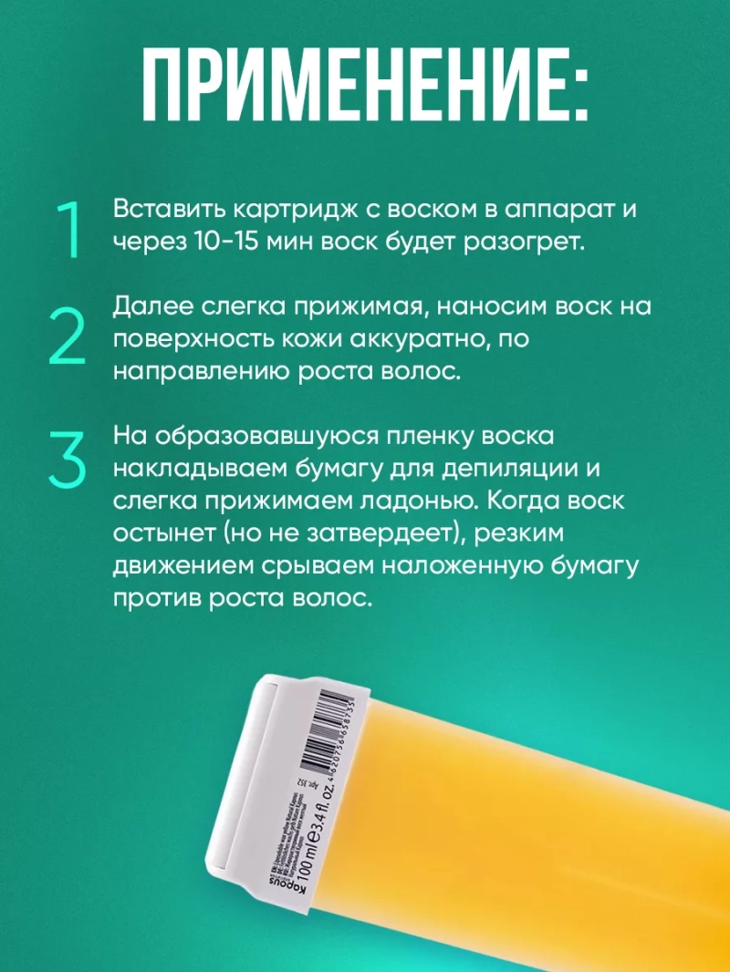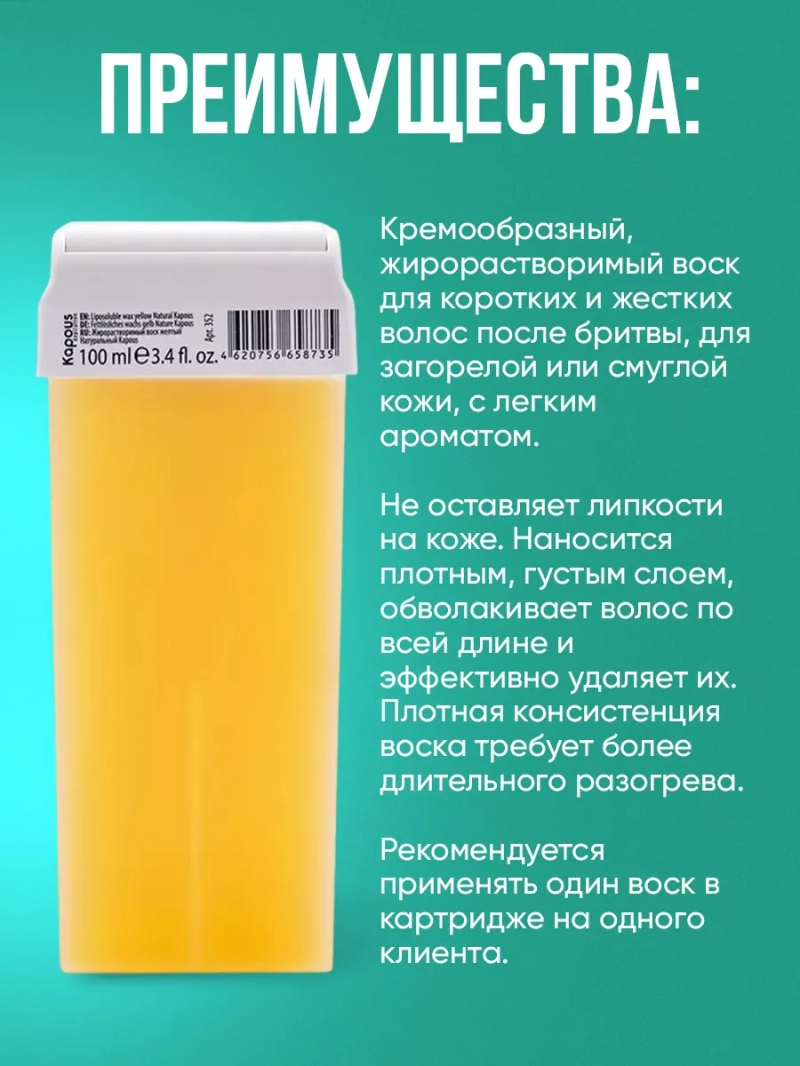 Нерасторжимая симфония натуральности и универсальности! Жирорастворимый воск Желтый Натуральный с широким роликом - классическое и всепоглощающее средство для самых требовательных девушек и женщин. Он стал must-have в области ухода за кожей и удаления нежелательных волосков. Благодаря уникальным свойствам, воск подарит вам гладкость кожи без боли и раздражения.Природа объявляет свои права! В состав воска входит натуральная смола, которая дарит ему нежную текстуру и высокое качество. Безупречное сочетание компонентов обеспечивает действительно эффективные и безопасные средства для депиляции и ухода за кожей.Ощутите магию жирорастворимости, которая делает процесс удаления волосков простым и комфортным. Наш воск легко справляется с задачей благодаря особому составу и передовому технологическому производству. Это гарантирует эффективное растворение воска на коже и полное удаление волос.Наш воск идеально подходит для всех типов кожи, сочетается с любыми проблемами и требованиями. Обновите свой образ жизни и доверьтесь натуральным компонентам, способным доставить самые свежие ощущения.Наш воск не оставляет липкости после использования, а также успокаивает и предотвращает воспаления, даря коже непревзойденный комфорт. Благодаря Азулену, он обладает смягчающим и увлажняющим эффектом, создавая идеальный баланс pH кожи и питая ее полезными элементами.Каждый картридж воска создается для использования с одним клиентом, гарантируя максимальную гигиену. Просто вставьте картридж в аппарат, нанесите воск на кожу, положите бумагу и сделайте рывок - перед вами появится гладкость.Наш воск изготовлен на основе натуральных компонентов, которые не наносят вреда, но решают множество проблем в области здоровья и красоты. Титановый диоксид защищает от солнца, мика создает перламутровый отлив, а эфирное масло шалфея успокаивает кожу.Попробуйте жирорастворимый воск Желтый Натуральный и откройте новую главу в своем образе жизни.