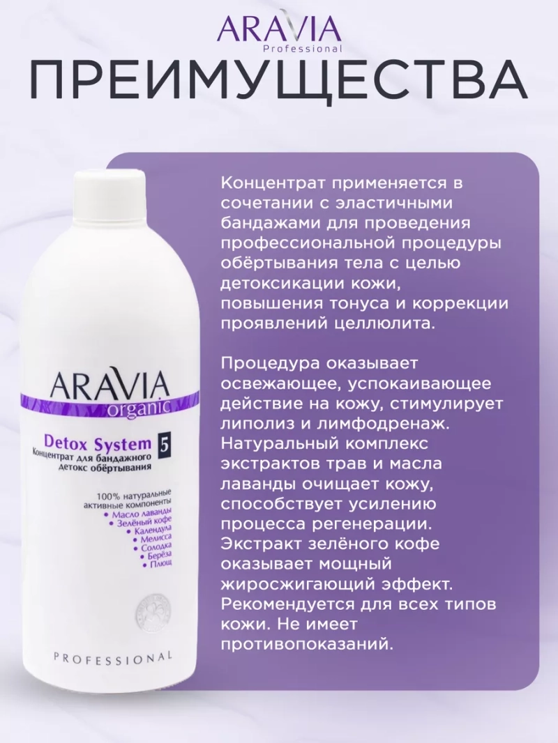 КОНЦЕНТРАТ ДЛЯ БАНДАЖНОГО ДЕТОКС ОБЁРТЫВАНИЯ DETOX SYSTEM, 500 МЛ. Концентрат применяется в сочетании с эластичными бандажами для проведения профессиональной процедуры обёртывания тела с целью детоксикации кожи, повышения тонуса и коррекции проявлений целлюлита. Процедура оказывает освежающее, успокаивающее действие на кожу, стимулирует липолиз и лимфодренаж. Натуральный комплекс экстрактов трав и масла лаванды очищает кожу, способствует усилению процесса регенерации. Экстракт зелёного кофе оказывает мощный жиросжигающий эффект. Рекомендуется для всех типов кожи. Не имеет противопоказаний. Назначение: процедура бандажного обертывания. Рекомендации для использования: Профессиональный уход: процедура бандажного обертывания. ДЕЙСТВИЕ:детоксицирующее, тонизирующее, антицеллюлитное, регенерирующее, жиросжигающее. Биоактивный состав: зелёный кофе, масло лаванды, солодка, мелисса, плющ, календула, берёза. Состав продукта (INCI): Aqua, Coffea Arabica (Coffee) Seed Extract, Glycyrrhiza Glabra (Licorice) Root Extract, Melissa Officinalis Extract, Hedera Helix (Ivy) Extract, Calendula Officinalis Extract, Betula Alba Leaf Extract, Panthenol, PEG-40 Hydrogenated Castor Oil, Sodium Laureth Sulfate, Niacin, Lavandula Angustifolia (Lavender) Oil, Benzyl Alcohol, Ethylhexylglycerin. СПОСОБ ПРИМЕНЕНИЯ: Только профессиональное применение. Замочить сухие бандажи в горячей воде. Развести концентрат (50 мл) чистой водой (50 мл) в отдельной ёмкости в пропорции 1:1. Поместить влажные бандажи в ёмкость с подготовленным раствором. Пропитать и отжать. Провести процедуру обёртывания. Через 20-30 минут удалите бандажи и завершите процедуру увлажняющим кремом. Меры предосторожности: не наносите на поврежденную кожу и избегайте попадания в глаза. При попадании в глаза тщательно промойте водой. Перед применением тестируйте на небольшом участке кожи.
