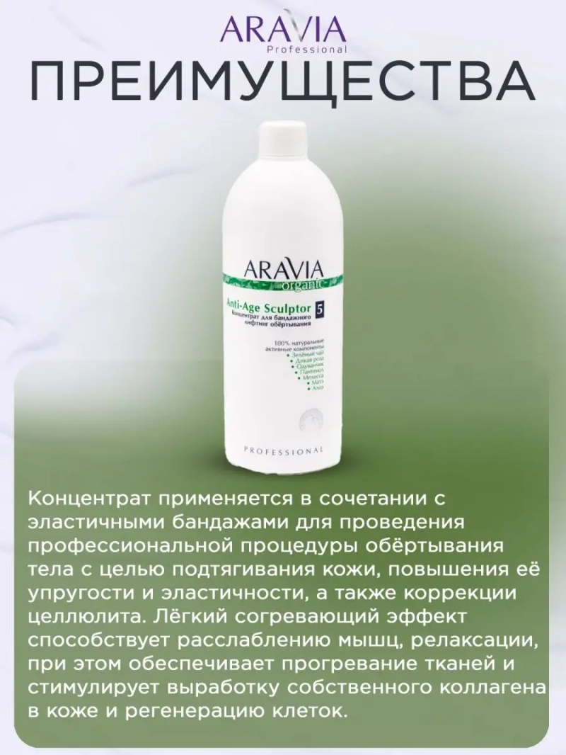 КОНЦЕНТРАТ ДЛЯ БАНДАЖНОГО ЛИФТИНГ ОБЁРТЫВАНИЯ ANTI-AGE SCULPTOR, 500 МЛ. Концентрат применяется в сочетании с эластичными бандажами для проведения профессиональной процедуры обёртывания тела с целью подтягивания кожи, повышения её упругости и эластичности, а также коррекции целлюлита. Лёгкий согревающий эффект способствует расслаблению мышц, релаксации, при этом обеспечивает прогревание тканей и стимулирует выработку собственного коллагена в коже и регенерацию клеток. Натуральный комплекс экстрактов трав и дикой розы усиливает микроциркуляцию, способствует уменьшению жировой ткани и объемов тела. Экстракт чая матэ насыщает кожу витаминами и дубильными веществами. Арома композиция обладает релаксирующим действием, улучшает эмоциональный фон. Даёт выраженный результат уже после первой процедуры. Назначение: процедура бандажного обертывания. Рекомендации для использования: Профессиональный уход: процедура бандажного обертывания. ДЕЙСТВИЕ: омолаживающее, лифтинговое, релаксирующее, жиросжигающее, антицеллюлитное. Биоактивный состав: дикая роза, матэ, зелёный чай, алоэ, одуванчик, мелисса, пантенол. Состав продукта (INCI): Aqua, Illex Paraguariensis extract, Camellia Sinensis Leaf Extract, Rosa Сanina Flower Extract, Taraxacum Officinale (Dandelion) Extract, Melissa Officinalis Extract, Panthenol, Aloe Arberescens Leaf Extract, PEG-40 Hydrogenated Castor Oil, Sodium Laureth Sulfate, Niacin, Parfum, DMDM Hydantoin (and) Iodopropynyl Butylcarbamate, Sodium-EDTA. СПОСОБ ПРИМЕНЕНИЯ: Только профессиональное применение. Замочить сухие бандажи в горячей воде. Развести концентрат (50 мл) чистой водой (50 мл) в отдельной ёмкости в пропорции 1:1. Поместить влажные бандажи в ёмкость с подготовленным раствором. Пропитать и отжать. Провести процедуру обёртывания. Через 20-30 минут удалите бандажи и завершите процедуру увлажняющим кремом. Меры предосторожности: не наносите на поврежденную кожу и избегайте попадания в глаза. При попадании в глаза тщательно промойте водой.