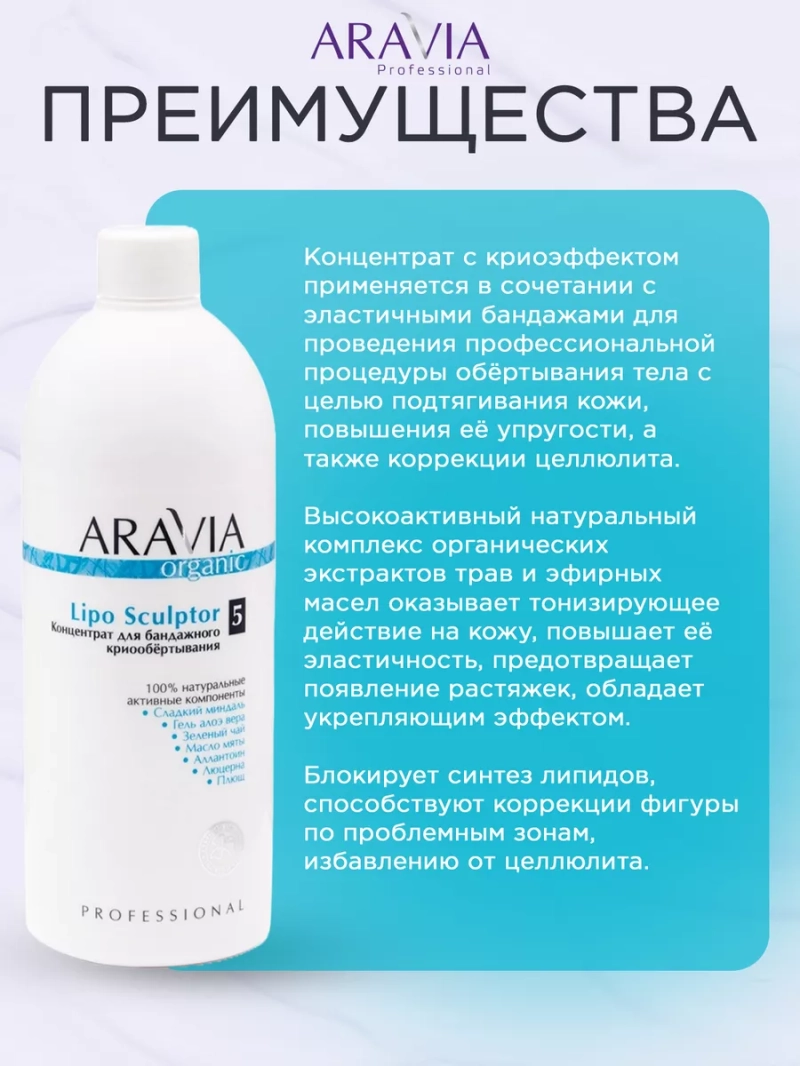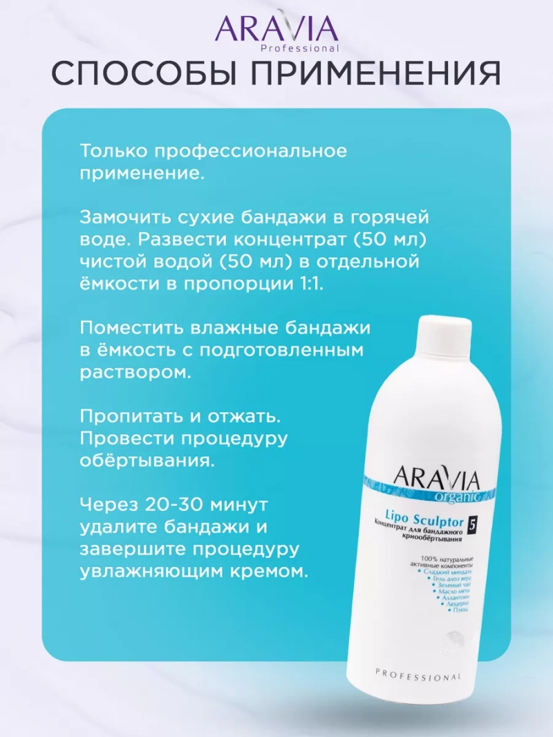 КОНЦЕНТРАТ ДЛЯ БАНДАЖНОГО КРИО ОБЁРТЫВАНИЯ LIPO SCULPTOR, 500 МЛ. Концентрат с криоэффектом применяется в сочетании с эластичными бандажами для проведения профессиональной процедуры обёртывания тела с целью подтягивания кожи, повышения её упругости, а также коррекции целлюлита. Высокоактивный натуральный комплекс органических экстрактов трав и эфирных масел оказывает тонизирующее действие на кожу, повышает её эластичность, предотвращает появление растяжек, обладает укрепляющим эффектом. Блокирует синтез липидов, способствуют коррекции фигуры по проблемным зонам, избавлению от целлюлита. Лёгкий эффект охлаждения является хорошей тренировкой сосудов, уменьшает отечность, способствует профилактике появления сосудистых патологий. Даёт выраженный результат уже после первой процедуры. Назначение: процедура бандажного обертывания. Рекомендации для использования: Профессиональный уход: процедура бандажного обертывания. ДЕЙСТВИЕ: антицеллюлитное, жиросжигающее, детоксицирующее, дренажное. Биоактивный состав: сладкий миндаль, гель алоэ вера, зеленый чай, масло мяты, аллантоин, люцерна, плющ. Состав продукта (INCI): Aqua, Glycerin, PEG-40 Hydrogenated Castor Oil, Hydrolyzed Sweet Almond Protein, Hydrolyzed Collagen, Organic Camelia Sinensis Leaf Extract, Medicago Sativa (Alfalfa) Extract, Organic Mentha PIperita Leaf Extract, Organic Aloe Barbadensis Gel, Panthenol, Mentha Piperita (Peppermint) Oil, Allantoin, Sodium Laureth Sulfate, Benzyl Alcohol, Methylchloroisothiazolinone, Methylisothiazolinone. СПОСОБ ПРИМЕНЕНИЯ: Только профессиональное применение. Замочить сухие бандажи в горячей воде. Развести концентрат (50 мл) чистой водой (50 мл) в отдельной ёмкости в пропорции 1:1. Поместить влажные бандажи в ёмкость с подготовленным раствором. Пропитать и отжать. Провести процедуру обёртывания. Через 20-30 минут удалите бандажи и завершите процедуру увлажняющим кремом. Меры предосторожности: не наносите на поврежденную кожу и избегайте попадания в глаза.