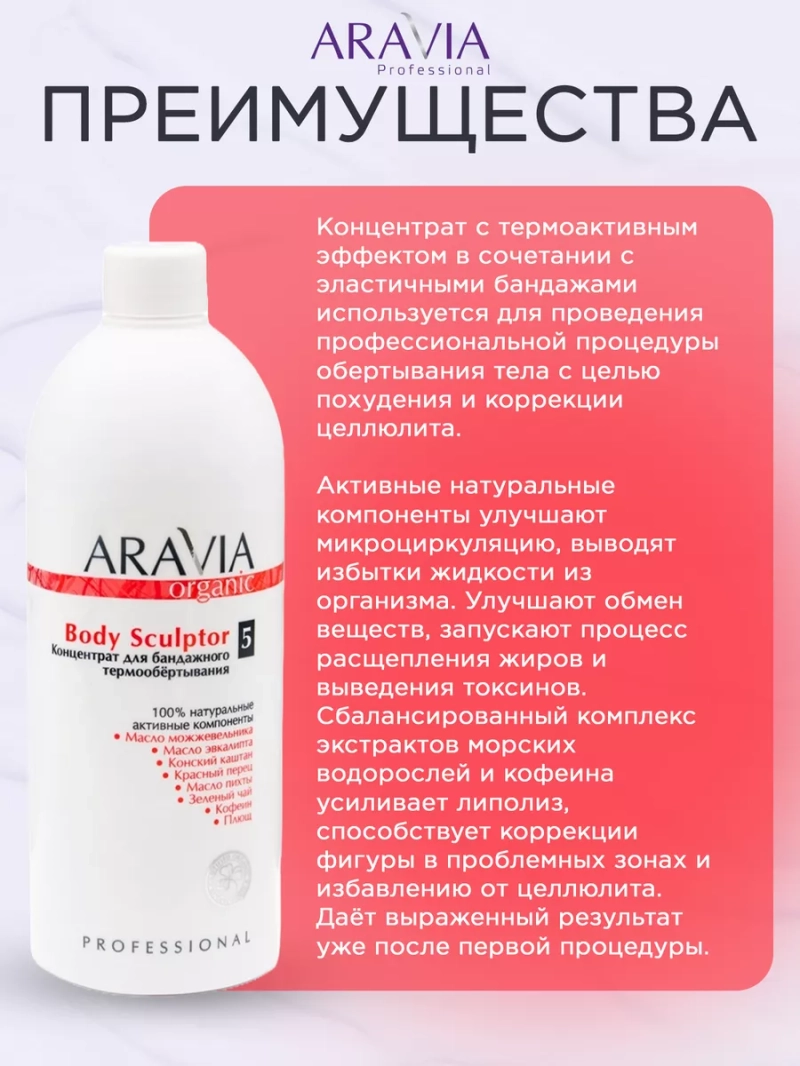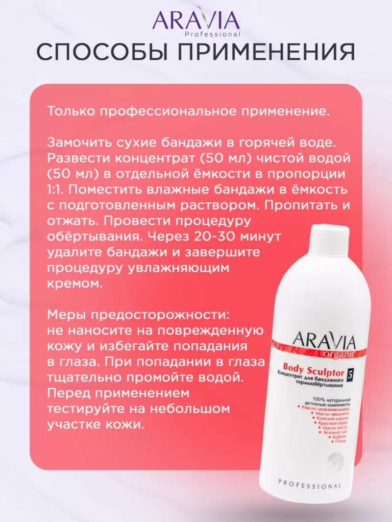 КОНЦЕНТРАТ ДЛЯ БАНДАЖНОГО ТЕРМООБЕРТЫВАНИЯ BODY SCULPTOR, 500 МЛ. Концентрат с термоактивным эффектом в сочетании с эластичными бандажами используется для проведения профессиональной процедуры обертывания тела с целью похудения и коррекции целлюлита. Активные натуральные компоненты улучшают микроциркуляцию, выводят избытки жидкости из организма. Улучшают обмен веществ, запускают процесс расщепления жиров и выведения токсинов. Сбалансированный комплекс экстрактов морских водорослей и кофеина усиливает липолиз, способствует коррекции фигуры в проблемных зонах и избавлению от целлюлита. Даёт выраженный результат уже после первой процедуры. Назначение: процедура бандажного обертывания. Рекомендации для использования: Профессиональный уход: процедура бандажного обертывания. ДЕЙСТВИЕ: антицеллюлитное, жиросжигающее, детоксицирующее, дренажное. Биоактивный состав: морские водоросли, масло пихты, можжевельника, масло эвкалипта, конский каштан, красный перец, зеленый чай, кофеин, плющ. Состав продукта (INCI): Aqua, PEG-40 Hydrogenated Castor Oil, Capsicum Frutescens Fruit Extract, Glycerin, Organic Camelia Sinensis Leaf Extract, Hedera Helix L Extract, Horse Chestnut Extract, Urea, Caffeine, Abies Sibirica Oil, Eucalyptus Globulus Leaf Oil, Juniperus Communis Essential Oil, Fucus Vesiculosus Extract, Laminaria Saccharina Extract, Sodium Laureth Sulfate, DMDM Hydantoin (and) Iodopropynyl Butylcarbamate, Sodium-EDTA. СПОСОБ ПРИМЕНЕНИЯ: Только профессиональное применение. Замочить сухие бандажи в горячей воде. Развести концентрат (50 мл) чистой водой (50 мл) в отдельной ёмкости в пропорции 1:1. Поместить влажные бандажи в ёмкость с подготовленным раствором. Пропитать и отжать. Провести процедуру обёртывания. Через 20-30 минут удалите бандажи и завершите процедуру увлажняющим кремом. Меры предосторожности: не наносите на поврежденную кожу и избегайте попадания в глаза. При попадании в глаза тщательно промойте водой. Перед применением тестируйте на небольшом участке кожи.