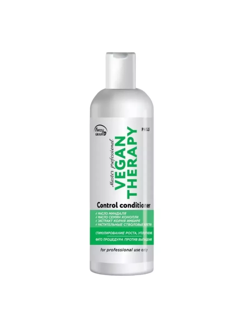 Терапевтический профессиональный кондиционер активатор роста волос Frezy Grand Vegan Therapy Control Conditioner PH 5.5 укрепляет волосы, борясь с причинами ломкости и выпадения. Снимает раздражение на чувствительной коже головы. Масло семян конопли содержит полиненасыщенные жиры и полезные вещества, которые дают бережное очищение кожи с противовоспалительным и увлажняющим эффектом. За счёт мягкого пилинга бальзам для волос улучшает кровоснабжение корней и способствует росту волос. Аминокислотный комплекс улучшит состояние слабых и поврежденных химическим и термическим воздействием волос. Благодаря маслу миндаля нормализуется деятельность сальных желез. Волосы перестают быстро принимать жирный вид. Масленые вещества кондиционера обладают антиоксидантной защитой. Это положительное качество защищает кутикулу волос, повышает количество зон роста. Также, входящая в состав аминокислота цистин, уже после нескольких применений улучшит состояние слабых и поврежденных волос. Растительные стволовые клетки выступают как мощный биоактиватор, и обновляют глубокие слои дермы. Кондиционер на каждый день Frezy Gran'd уплотняет волосы, устраняет зуд, уменьшает выпадение, предотвращает образование седины. Кондиционер для волос подходит для частого применения. Профессиональный бальзам для волос создаёт защитный барьер, который защищает волосы от вредного воздействия ультрафиолета. Женская уходовая косметика предназначена для нормальных, сухих, тусклых и слабых волос. Способ применения: Нанести на волосы, предварительно вымытые шампунем. Распределить по всей длине и оставить на 2–3 минуты. Смыть. Приступить к дальнейшим процедурам или высушить волосы. ВНИМАНИЕ! ПРЕДУПРЕЖДАЕМ! В связи с участившейся сменой производителями стиля упаковки и концепции своего товара, мы предупреждаем, что Вам могут доставить товар как на фотографии, так и в новой упаковке. Весь товар является оригинальным и приобретен напрямую у заводов, есть все необходимые документы.
