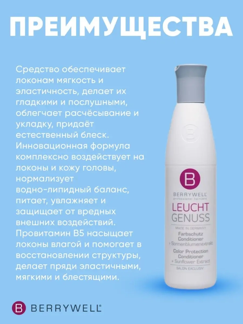 Кондиционер мгновенного действия Color Protection Express 251 мл. Кондиционер Berrywell Color Protection Conditioner сочетает в себе бережный уход за окрашенными волосами и непревзойдённую защиту цвета. Средство обеспечивает локонам мягкость и эластичность, делает их гладкими и послушными, облегчает расчёсывание и укладку, придаёт естественный блеск.Инновационная формула комплексно воздействует на локоны и кожу головы, нормализует водно-липидный баланс, питает, увлажняет и защищает от вредных внешних воздействий.Провитамин B5 насыщает локоны влагой и помогает в восстановлении структуры, делает пряди эластичными, мягкими и блестящими.Гидролизованный протеин пшеницы, известный своим мощнейшим увлажняющим и антиоксидантным действием, препятствует потере драгоценной влаги и создаёт на поверхности тончайшую плёнку, защищающую от преждевременного старения и травмирования вследствие внешних факторов.Экстракт подсолнуха придаёт упругость, мягкость и блеск, и сохраняет яркость оттенка окрашенных локонов даже под действием агрессивного солнца, сухого воздуха и солёной воды.Экстракт конского каштана активизирует микроциркуляцию и обмен в коже головы, укрепляет волосяные фолликулы и способствует увеличению густоты и объёма волос.Применение: после мытья шампунем нанести средство на влажные пряди по всей длине и выдержать 5-10 минут. После тщательно смыть.