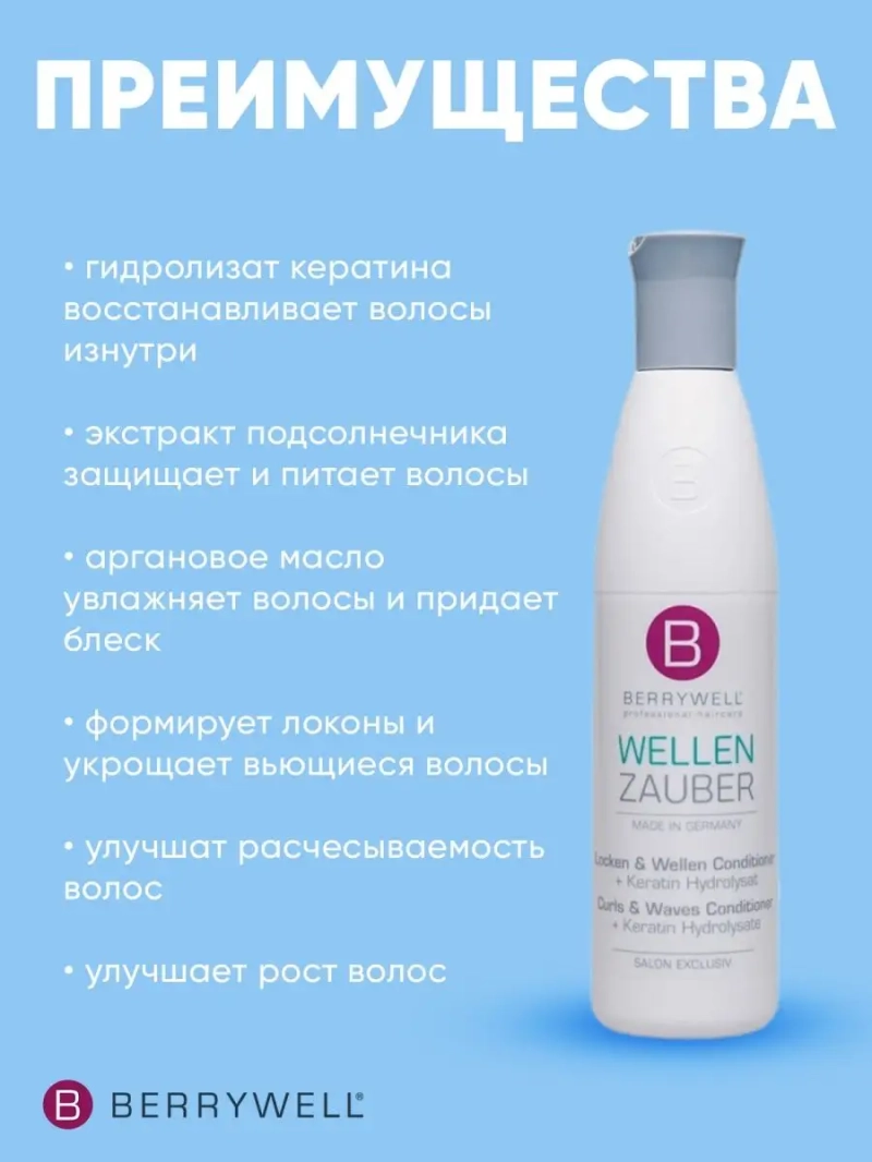 Кондиционер д/кудр.вол. Curls & Waves 251 мл. Кондиционер для кудрявых или волнистых волос Berrywell, с гидролизатом кератина и экстрактом подсолнечника, обладает мультиактивным действием, глубоко проникает в волосы, восстанавливая их повреждённую структуру, и оказывает заметный ухаживающий эффект. Улучшает расчёсываемость и делает волосы приятными на ощупь.Применение: помыв волосы, равномерно нанести на них кондиционер и распределить по волосам от корней до самых кончиков. Дать подействовать в течение короткого времени и тщательно промыть. Особенности: гидролизат кератина восстанавливает волосы изнутри;экстракт подсолнечника защищает и питает волосы;аргановое масло увлажняет волосы и придает блеск;формирует локоны и укрощает вьющиеся волосы;улучшат расчесываемость волос;улучшает рост волос.