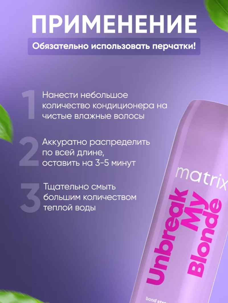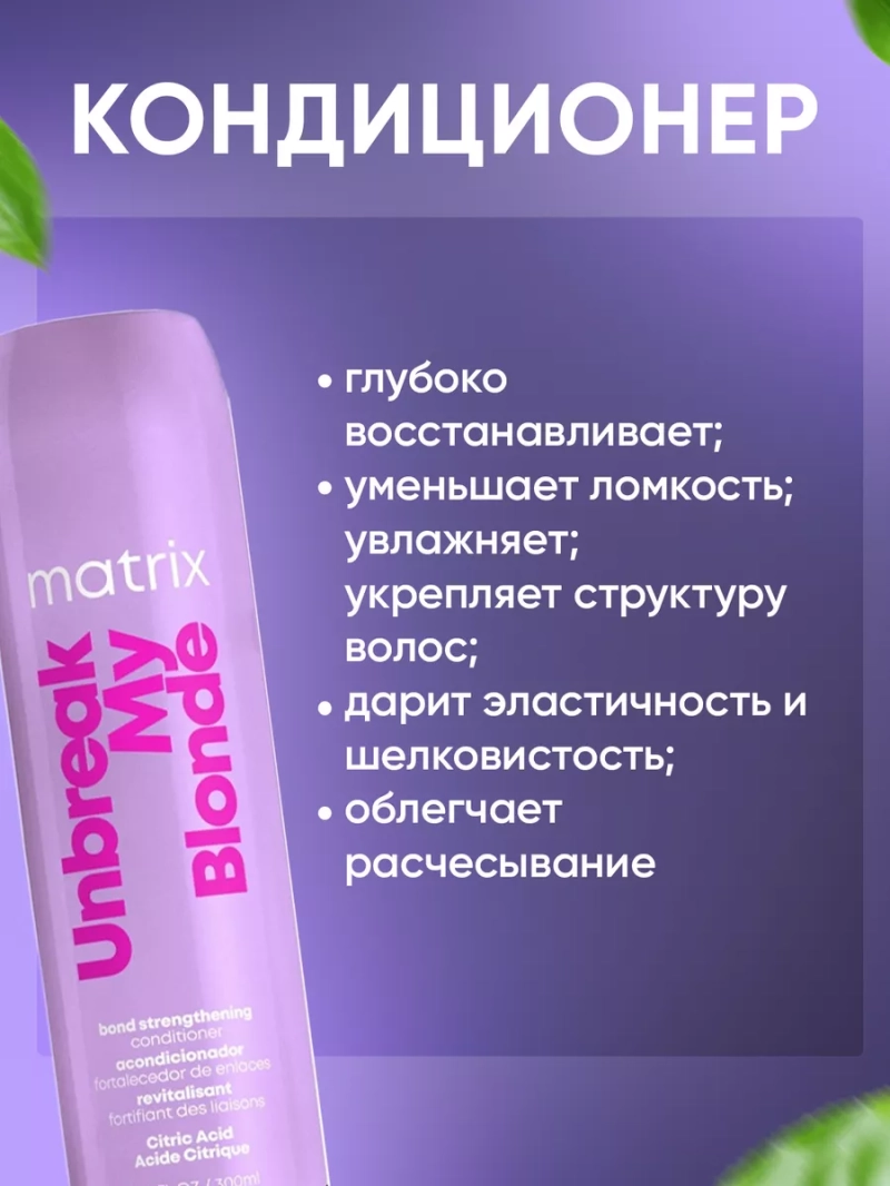 Часто после процедур обесцвечивания, осветления и мелирования ухудшается качество. Они выглядят сухими, безжизненными, тусклыми, появляется ломкость и секущиеся кончики. Профессиональная гамма L'Oreal Matrix Total Results Unbreak My Blonde (Лореаль Матрикс Тотал Резалтс Анбрейк май Блонд) создана для решения проблем осветленных волос любых типов и видов. Это уникальная система ухода, направленная на укрепление и восстановление волос, подвергшихся химическому воздействию. Несмотря на то, что линейка является идеальной для блондинок, средства отлично работают на любых окрашенных, мелированных, седых, осветленных, поврежденных волосах, любых оттенках блонда, а также после бондинга (бонда). Также могут использоваться на натуральных волосах светлых и светло-русых оттенков. Кондиционер Unbreak My Blonde глубоко увлажняет, укрепляет и смягчает волосы. Бальзам обеспечивая полное восстановление по всей длине. Повышенная концентрация лимонной кислоты возвращает волосам жизненную силу, невероятный блеск и здоровый вид. Уникальная формула восстанавливает пористые волосы, разглаживает кутикулу, дарит эластичность и шелковистость. Мощная комбинация питательных и укрепляющих компонентов призвана для оживления ослабленных и восстановления чрезмерно обработанных волос. Бережная технология без сульфатов минимизирует ломкость, обеспечивания PH балансирование. Безопасный состав средства помогает укрепить ранее осветленные волосы и защитить цвет от вымывания. Использовать кондиционер рекомендуется сразу после процедуры обесцвечивания или осветления при каждом мытье. Высококондиционирующая бессульфатная технология кондиционера укрепляет ослабленные связи и оживляет обесцвеченные пряди, делает волосы невероятно мягкими, блестящими и сильными. Не утяжеляет, убирает лишнюю пушистость и увлажняет, делает волосы упругими и эластичными. Средство предотвращает электризацию волос, делает волосы послушными, гладкими, облегчает расчесывание и укладку. Подходит для ежедневного использования.