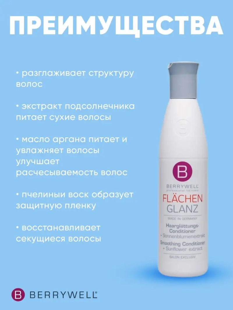 Кондиционер для разглаживания вьющихся волос Berrywell, 251 мл. Кондиционер для разглаживания волос Berrywell с экстрактом подсолнечника и аргановым маслом, оказывает сильное кондиционирующее действие на повреждённые, преждевременно состарившиеся, сухие и секущиеся волосы. Улучшает их расчёсываемость. Применение: помыв волосы, равномерно нанести на них кондиционер и распределить по волосам от корней до самых кончиков. Дать подействовать в течение короткого времени и тщательно промыть. Действие: разглаживает структуру волос;экстракт подсолнечника питает сухие волосы;масло аргана питает и увлажняет волосы;улучшает расчесываемость волос;пчелиныий воск образует защитную пленку;восстанавливает секущиеся волосы.