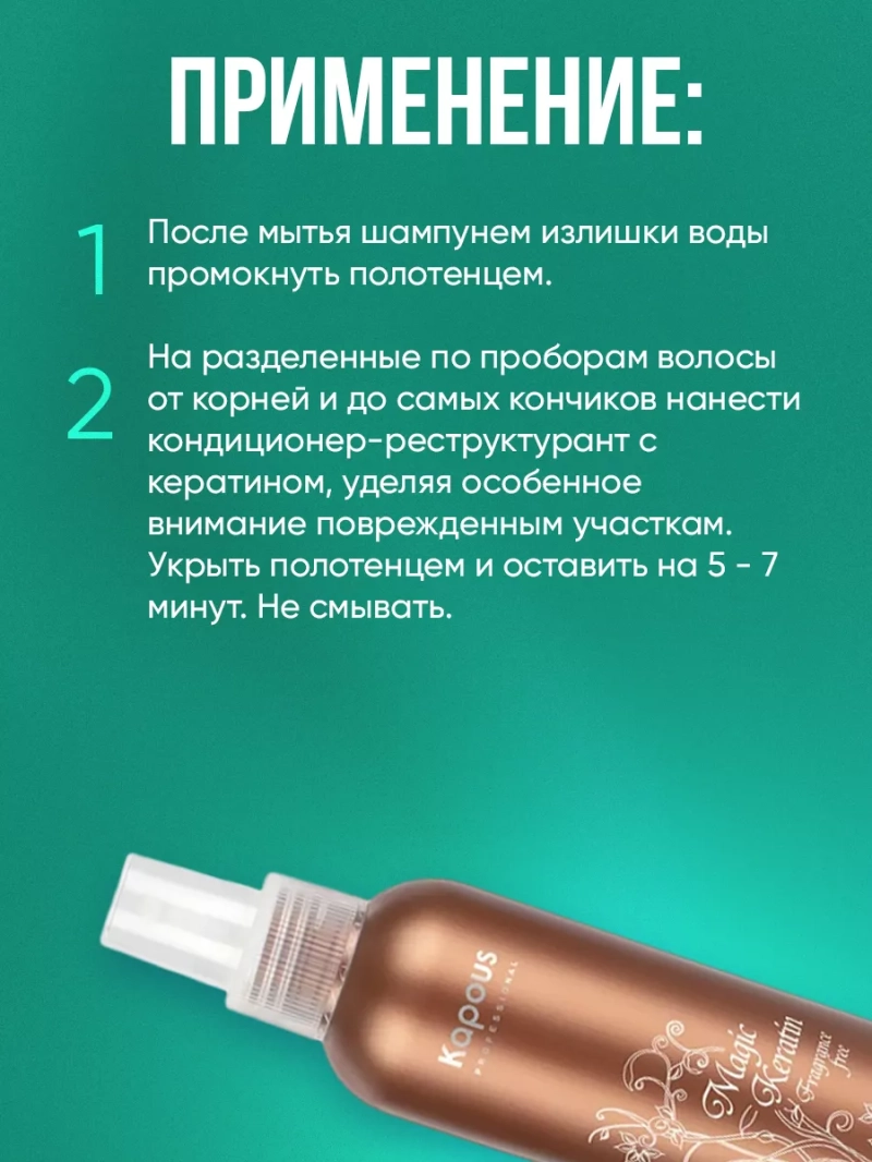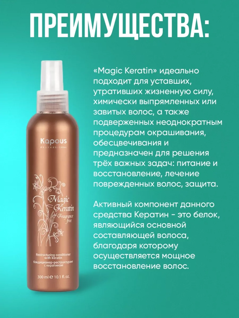 Кондиционер-реструктурант с кератином серии "Magic Keratin" KAPOUS для восстановления и реструктуризации сухих и сильно поврежденных волос идеально подходит для уставших, утративших жизненную силу, химически выпрямленных или завитых волос, а также подверженных неоднократным процедурам окрашивания, обесцвечивания и предназначен для решения трёх важных задач: питание и восстановление, лечение поврежденных волос, защита.Активный компонент данного средства Кератин - это белок, являющийся основной составляющей волоса, благодаря которому осуществляется мощное восстановление волос – проникая глубоко в структуру волоса, молекулы кератина достраивают поврежденные перемычки, что делает его более сильным и блестящим. Высокоактивные компоненты кондиционера активизируют регенеративные процессы в волосах, смягчая и восстанавливая поврежденные слои волос, положительно влияют на синтез кератина, в результате чего повышается упругость и эластичность.. Состав: трегалоза, мочевина, бензиловый спирт, косметическая основа, кератин, глицерин, вода