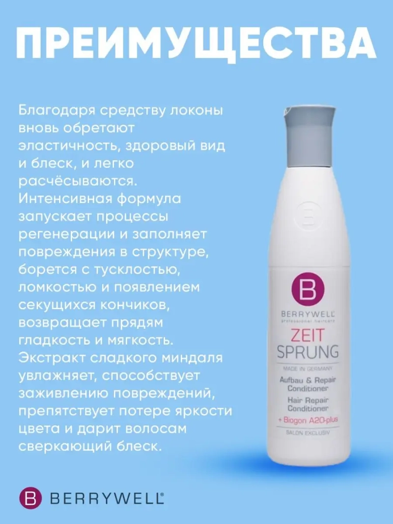 Кондиционер для восстановления сильно поврежденных волос мгновенного действия Hair Repair Express 251 мл. Кондиционер Berrywell Hair Repair Conditioner отлично действует в комплексе с шампунем из одноимённой серии, восстанавливая сухие, ослабленные или поврежденные после технических процедур волосы. Благодаря средству локоны вновь обретают эластичность, здоровый вид и блеск, и легко расчёсываются.Интенсивная формула запускает процессы регенерации и заполняет повреждения в структуре, борется с тусклостью, ломкостью и появлением секущихся кончиков, возвращает прядям гладкость и мягкость.Экстракт сладкого миндаля увлажняет, способствует заживлению повреждений, препятствует потере яркости цвета и дарит волосам сверкающий блеск.Протеины пшеницы насыщают локоны влагой, предотвращая её потерю, и защищают от действия вредных внешних факторов, придают эластичность и мягкость.D-пантенол улучшает структуру, укрепляя и уплотняя локоны, выравнивает поверхность, делает волосы шелковистыми и послушными.Липиды и воск создают невидимую плёнку для защиты от внешних воздействий и придания ещё большей гладкости.UVA и UVB фильтры надёжно предохраняют пряди от вредного действия солнечных лучей.Применение: нанести средство равномерно на влажные волосы, выдержать 5–10 минут, затем тщательно промыть водой.